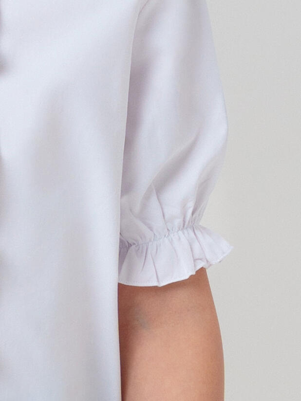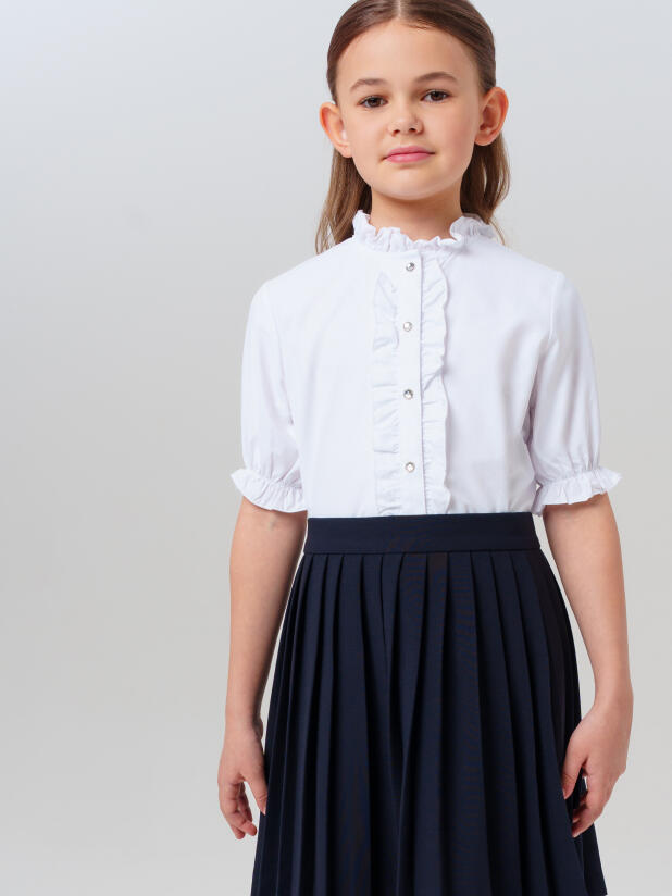Лёгкий силуэт обеспечивает свободу движений — ребёнку будет удобно на уроках, переменах и любых школьных активностях. Нарядные воланы по переду добавляют изюминку образу, а застёжка на кнопках позволяет легко надеть блузку без помощи взрослых.