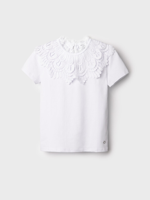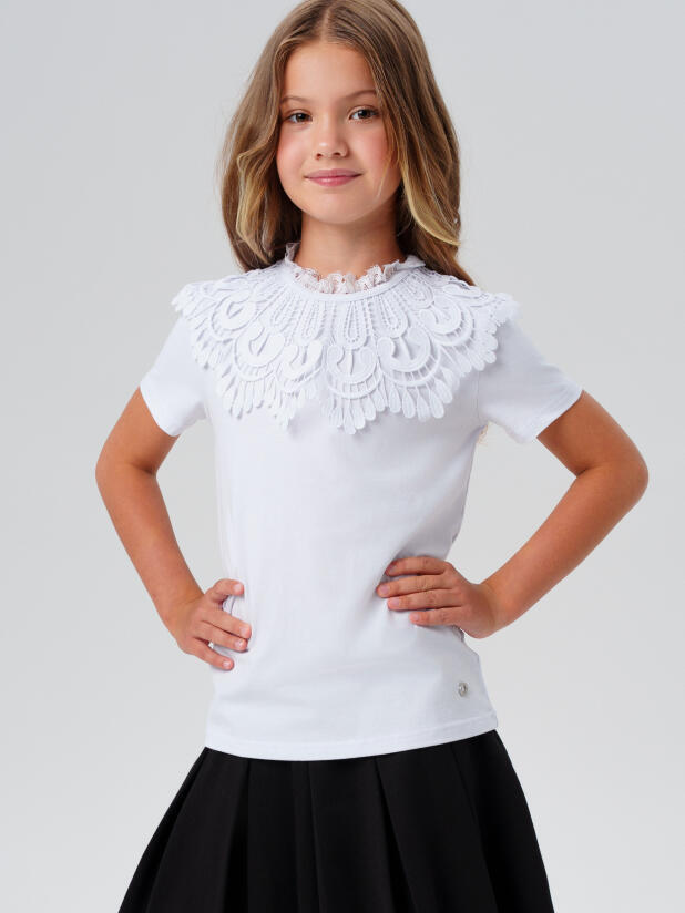Прямой крой не сковывает движений, создавая удобную посадку для учёбы, активных перемен и школьных мероприятий. А ажурное кружево спереди добавляет образу изящности и делает блузку подходящей не только для повседневных школьных дней, но и для праздников, линеек или выпускного.