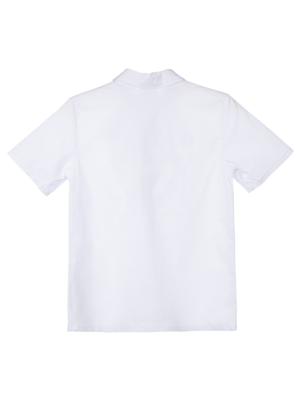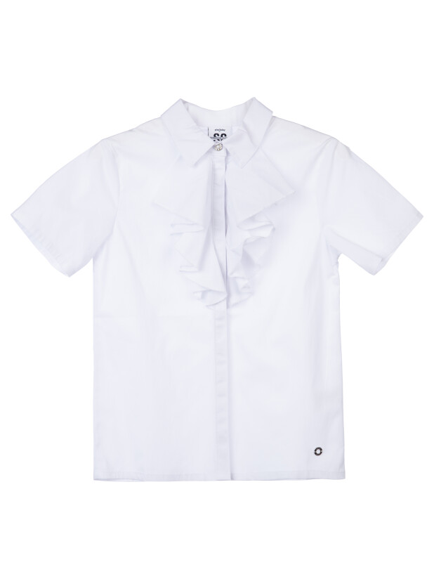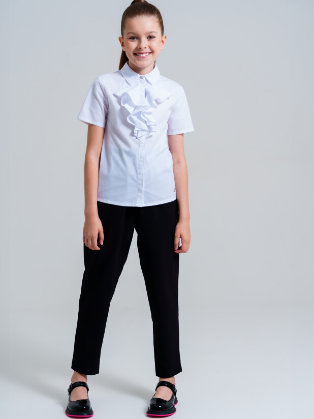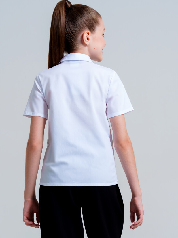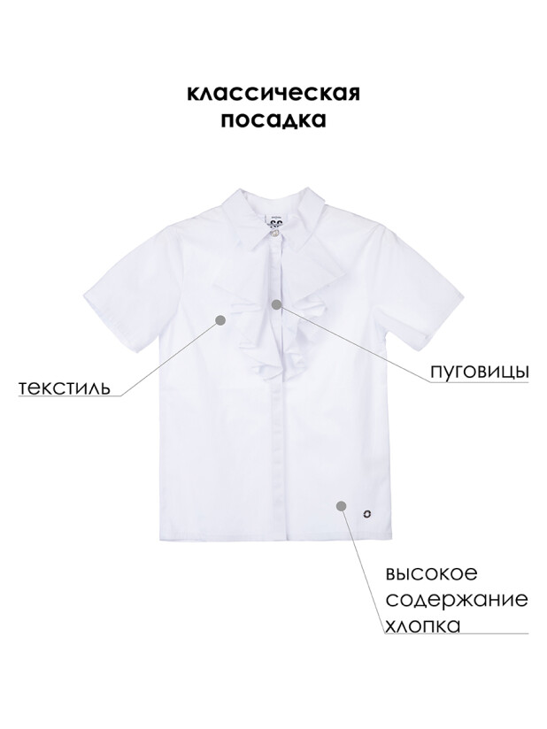 Эта нарядная школьная блузка для девочки с коротким рукавом станет основой стильного и аккуратного образа на каждый день. Белая блузка одинаково уместна и на уроках, и на торжественных линейках, экзаменах или выпускных. Лаконичный силуэт, классический воротник и пуговицы делают модель универсальной — строгая, но с лёгким акцентом на элегантность.