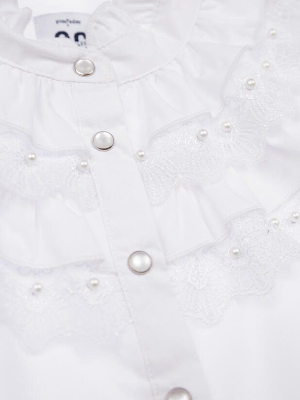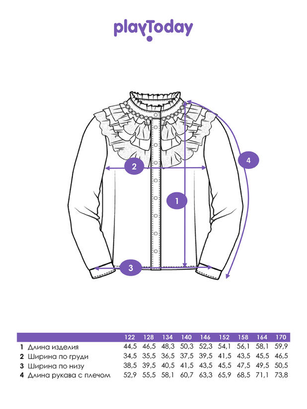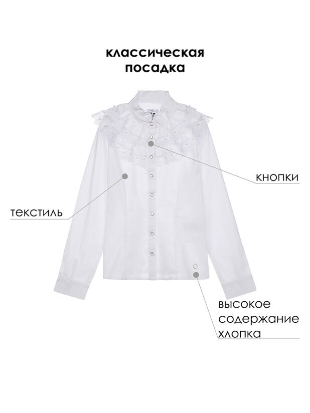 О товаре Белая нарядная текстильная блузка полуприлегающего силуэта, приталенная для девочки подростка. Школьная блузка на кнопках очень мягкая и приятная на ощупь, хорошо держит форму, комфортна в носке и проста в уходе. Рубашка в школу с длинным рукавом и воротником из кружевных рюш с перламутровыми бусинами разнообразит повседневные школьные образы. СОСТАВ 69% хлопок, 29% полиэстер, 2% эластан. Уход Максимальная температура стирки 30°С. Мягкий режим. Не отбеливать. Утюжить при температуре не более 110°С. Чистка запрещена. Не применять сушку в барабане. Стирать с вещами такой же окраски. Стирать вывернутым наизнанку. Не утюжить отделку. Предварительная стирка обязательна. Утюжить с изнаночной стороны. Бренд PlayToday АРТИКУЛ 22127042 Цвет Белый Возрастная категория Школьники, Подростки Пол Женский Сезон Осень, Демисезон Год коллекции 2025 Страна бренда Германия Страна производства Китай Возраст 8 лет, 9 лет, 10 лет, 11 лет, 12 лет, 7 лет Маркировка Товары легкой промышленности и одежда Миниколлекция School