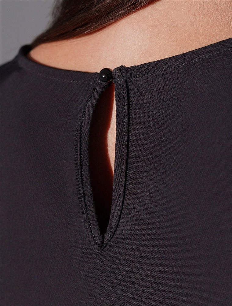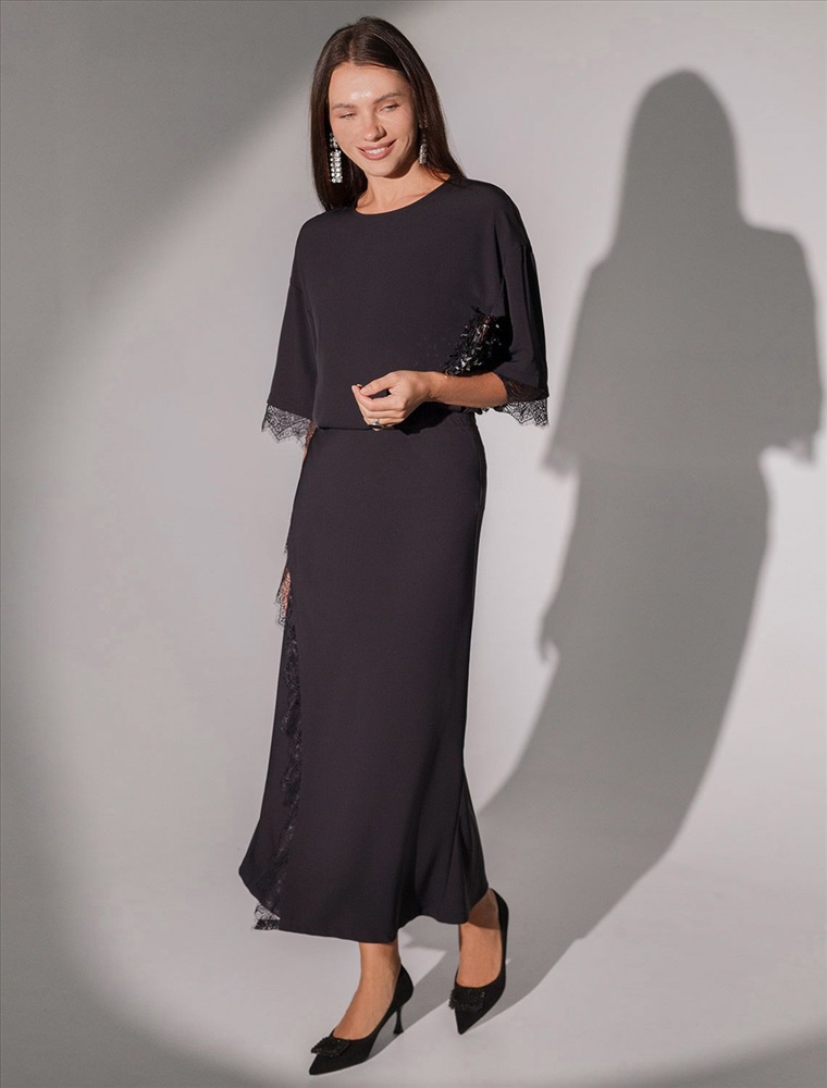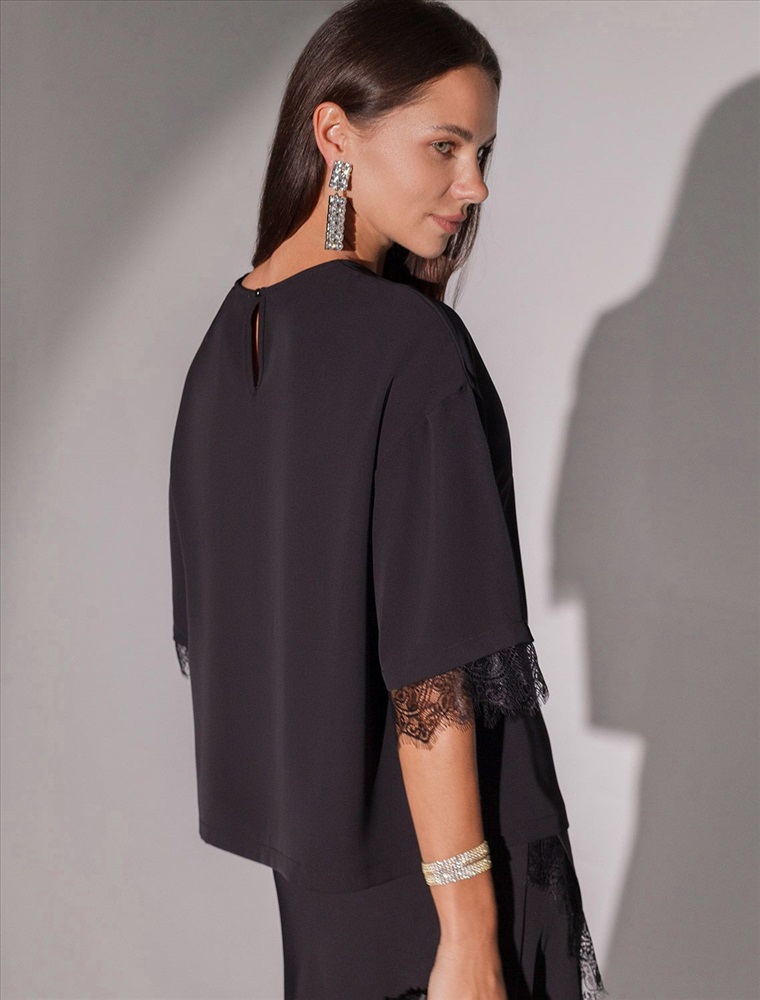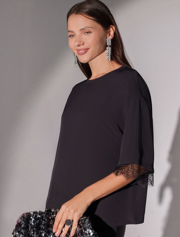Свободная блузка черного цвета из креп-шифона отличается изящным кроем и особым вниманием к деталям. Блузка с круглым вырезом и спущенной линией плеча создает элегантный образ, идеально подходящий для делового дресс-кода или праздничного мероприятия. Натуральная ткань обеспечивает приятное и комфортное ощущение на теле, позволяя коже дышать в течение всего дня, сохраняет форму и презентабельный вид даже после длительного ношения. Широкие рукава свободно струятся, подчеркивая нежную текстуру материала и придавая образу легкость. Блузка идеально подойдет на большие размеры, в ней вы будете чувствовать себя уверенно. Особый акцент сделан на кружеве на рукавах, которое добавляет стильной блузке изящности и подходит для различных случаев.