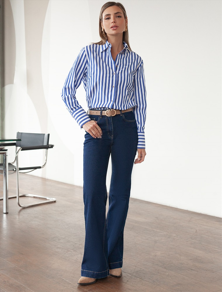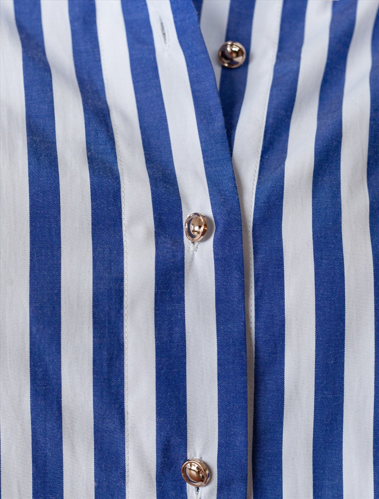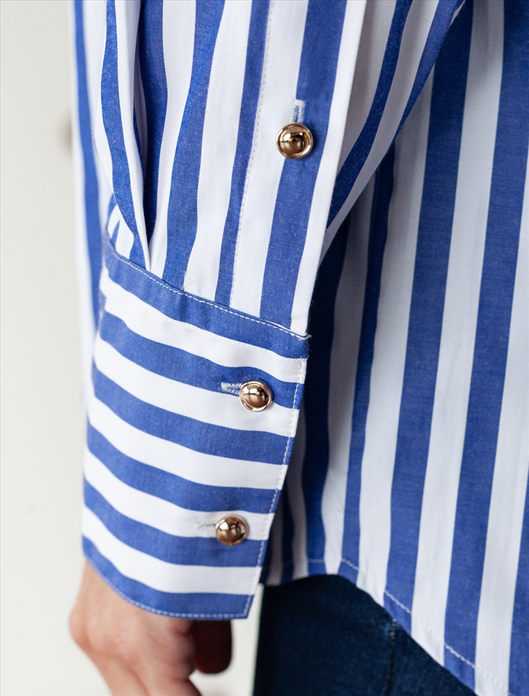 Блузка свободного силуэта выполнена из смесовой струящейся ткани. Модель в вертикальную полоску дополнена золотистыми рельефными пуговицами. Свободный силуэт подходит для любой фигуры. Для идеального роскошного образа используйте в качестве низа брюки светлых тонов. На спинке изделия фирменный металлический логотип бренда.