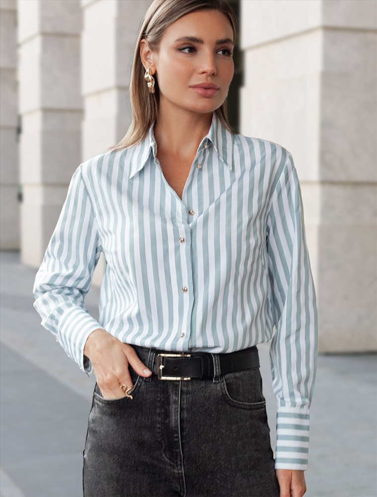 Параметры модели на первом фото: Рост 170, бюст 89, талия 63, бедра 92 Блузка свободного силуэта выполнена из смесовой струящейся ткани. Модель в вертикальную полоску дополнена золотистыми рельефными пуговицами. Свободный силуэт подходит для любой фигуры. Для идеального роскошного образа используйте в качестве низа брюки светлых тонов. На спинке изделия фирменный металлический логотип бренда.