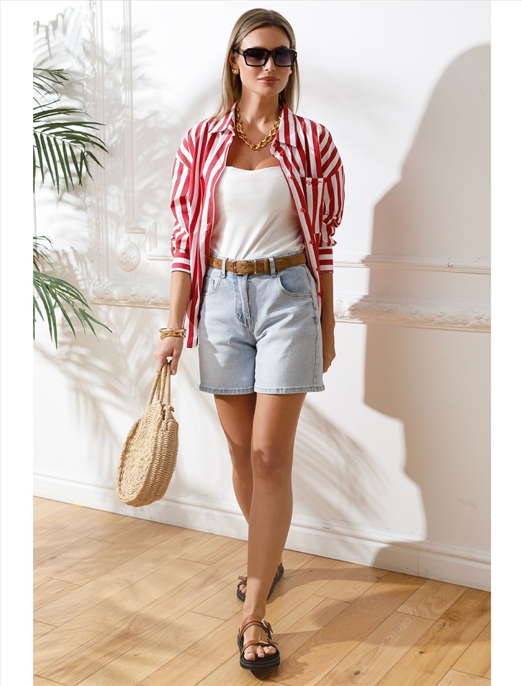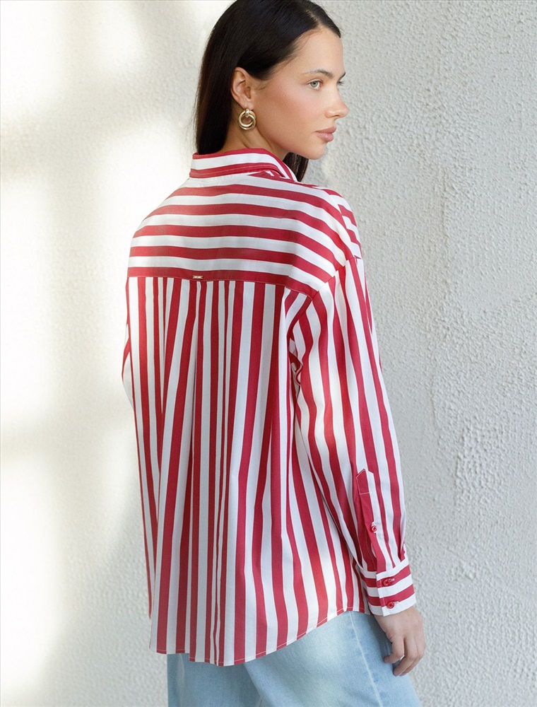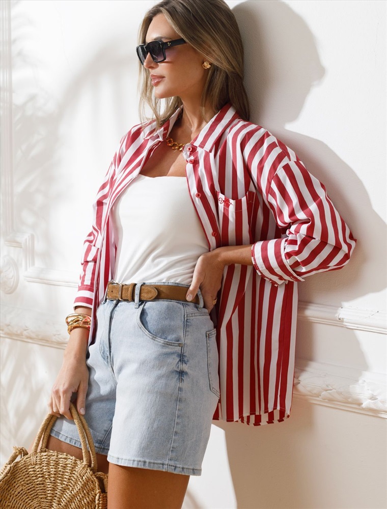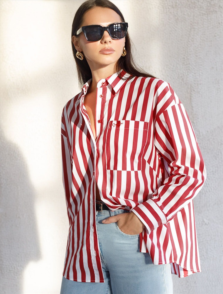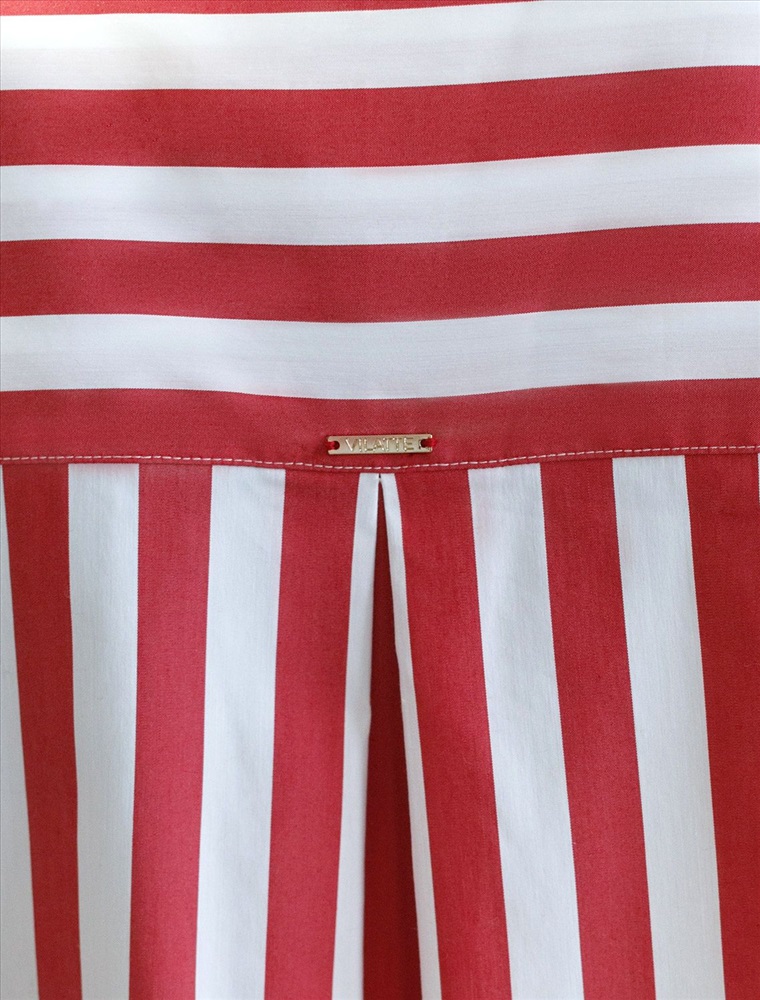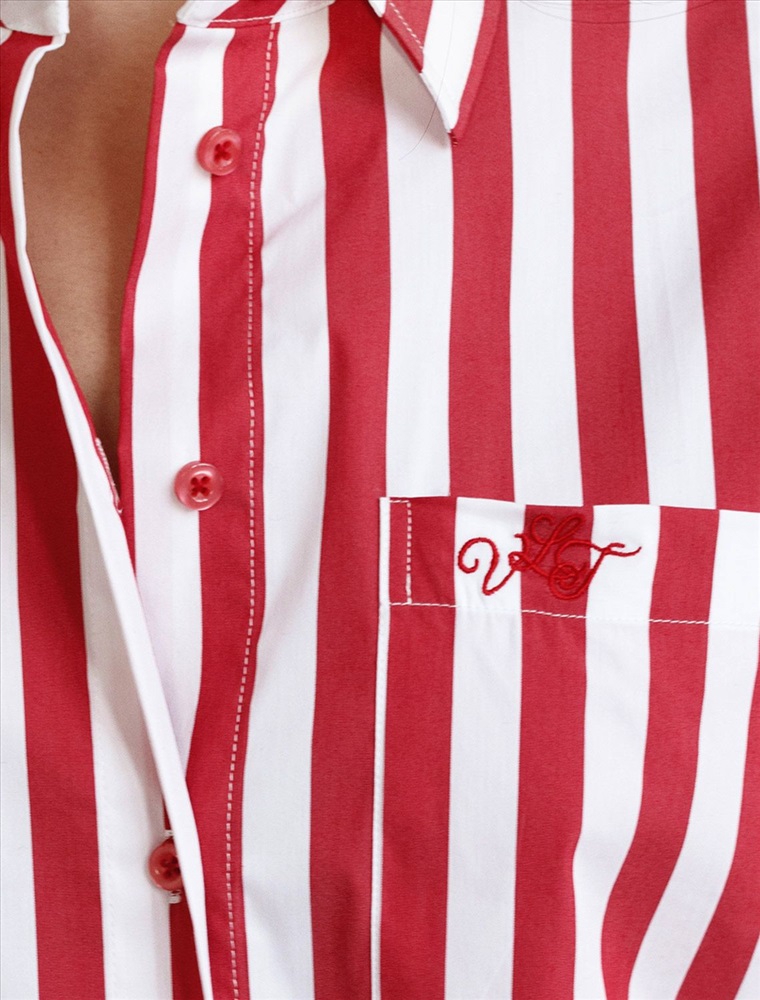 Эффектная блузка белого цвета в красную полоску свободного силуэта станет главным акцентом вашего повседневного образа. Контрастные широкие полосы освежают внешний вид и придают уверенности в любой ситуации. Благодаря хлопку с добавлением эластана блузка отлично держит форму, а принт полоска стройнит и визуально вытягивает силуэт. Яркая и стильная рубашка с отложным воротничком подчеркнет вашу элегантность. Удлиненная спинка со складкой смотрится оригинально и добавит динамики. На кармане блузки выполнена вышивка по авторскому эскизу дизайнера — буквы V L T, оформленные вензельным шрифтом. Сама вышивка выполнена техникой «застил» машинным способом. Такой декоративный элемент добавляет премиальности образу. Рукава обработаны широким манжетом на 2 пуговицы. Дополнительная пуговица на планке рукава не даёт раскрываться и топорщиться разрезу. Повседневная и практичная, такая блузка подойдет на весну и лето, обеспечивая легкость и комфорт благодаря натуральному материалу. Мягкий эластичный хлопок приятен к телу и хорошо пропускает воздух, что особенно актуально в теплую погоду. Модель гармонично смотрится на разных размерах, в том числе и больших, а свободный крой не сковывает движений, подчеркивая индивидуальность и современный стиль.