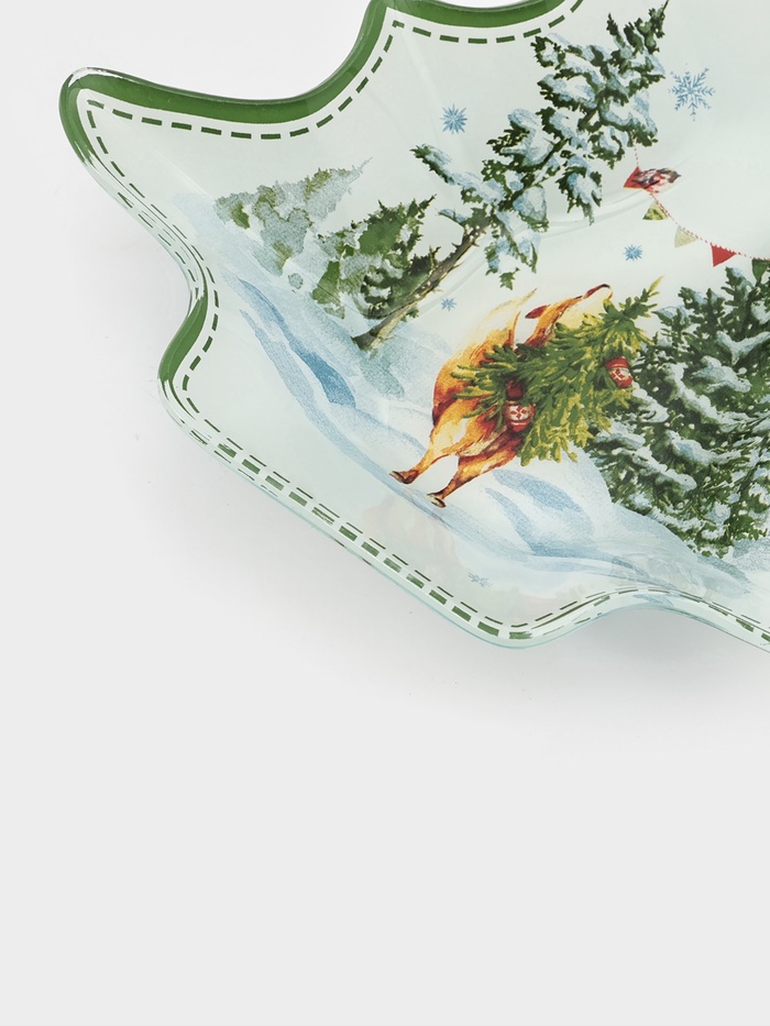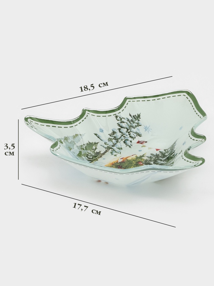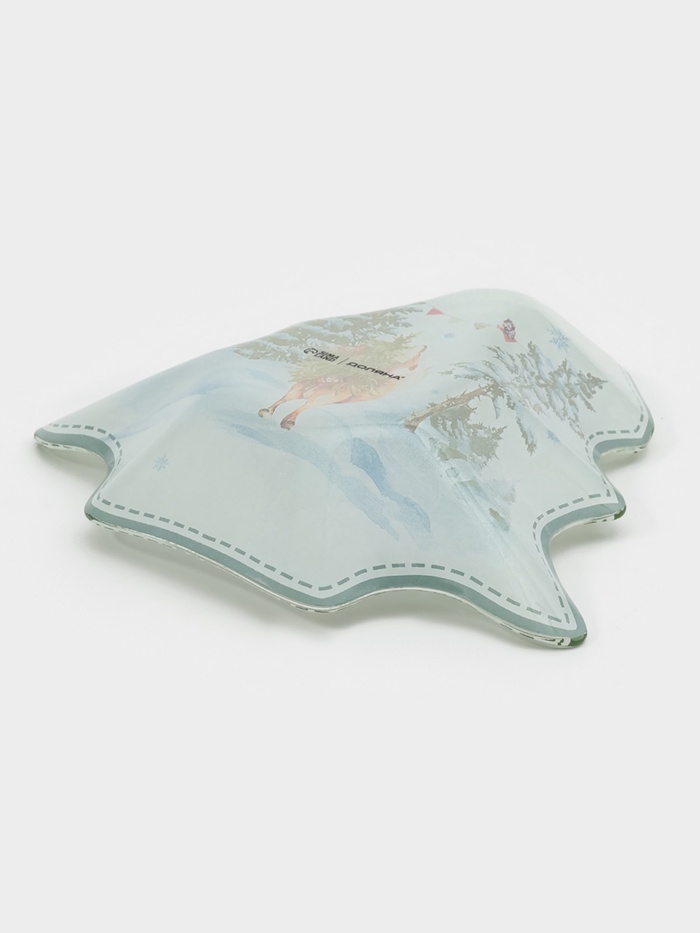 Праздник — в деталях, а уют — в лесных мотивах! Сервировочное блюдо — это фигурное стеклянное блюдо с новогодним рисунком в бело-зелёной палитре.