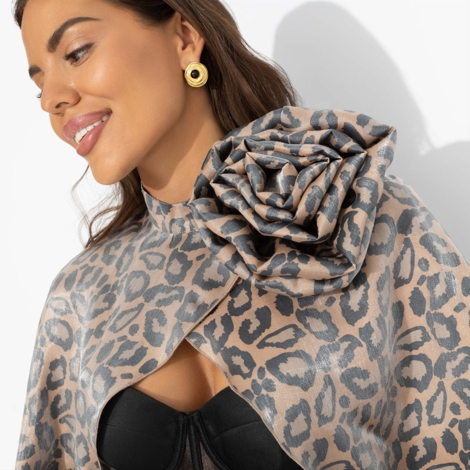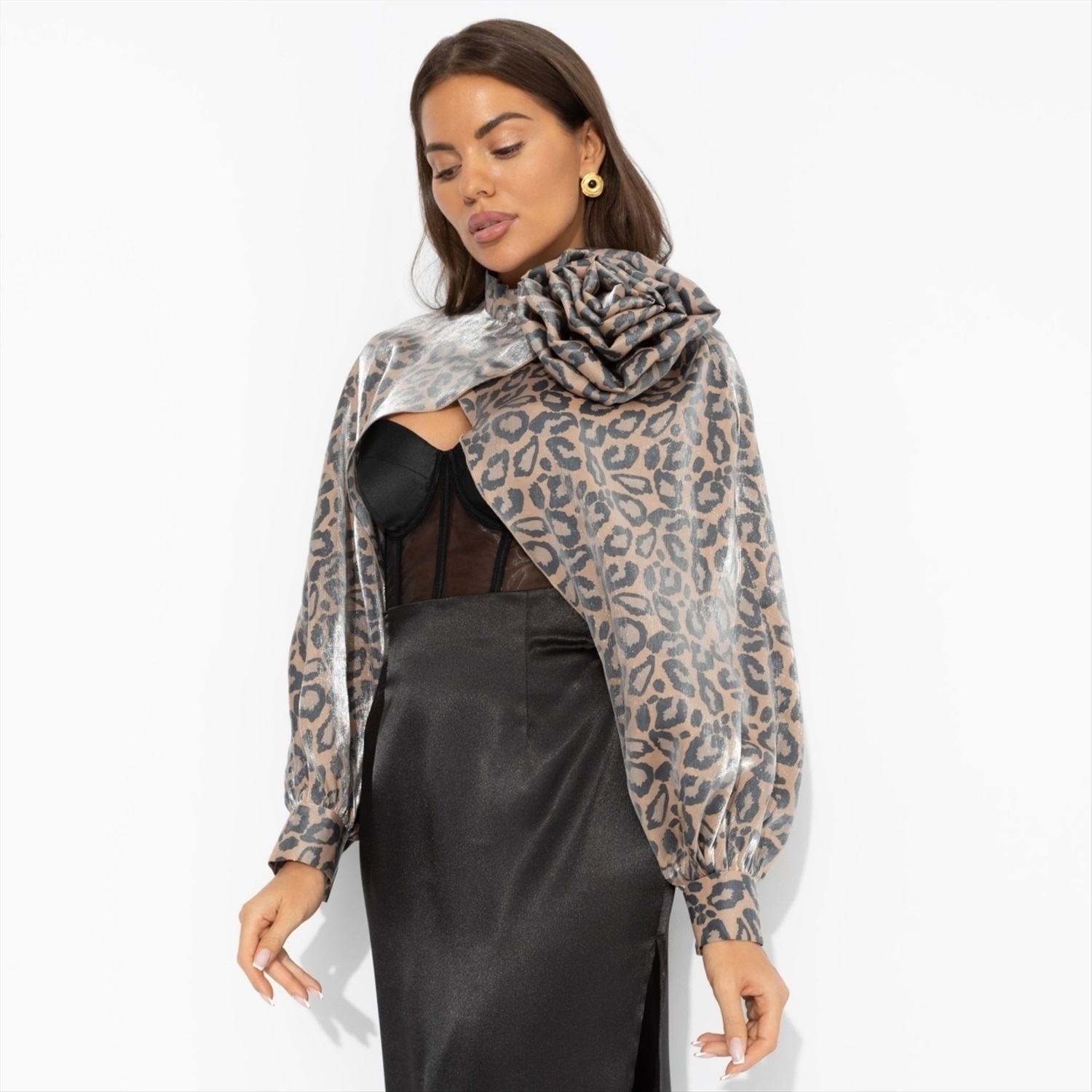 Для тех, кто избегает масштабного леопардового принта, дизайнеры ЧАРУТТИ создали болеро. Добавляйте дозированную порцию анималистичной расцветки в любые образы – с джинсами, вечерними платьями или деловыми юбками. Болеро из мерцающей органзы со свободными рукавами. Брошь-роза съемная. Деликатная пуговица в тон изделия сзади.