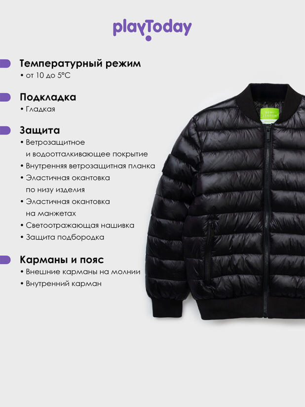 Классическая черная демисезонная куртка бомбер для мальчика подростка от PlayToday — стильная и тёплая модель на весну и прохладную осень. Отличный выбор для школы, прогулок и активных будней. Лаконичный крой, практичные материалы и удобство на каждый день.
