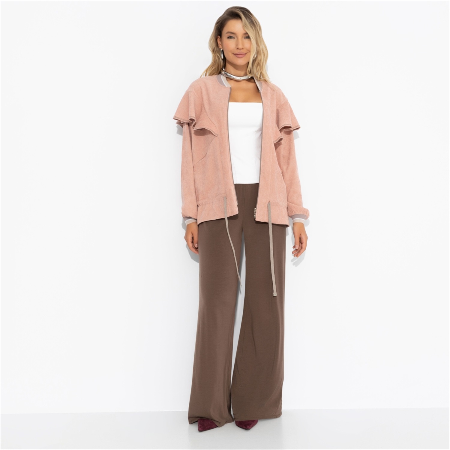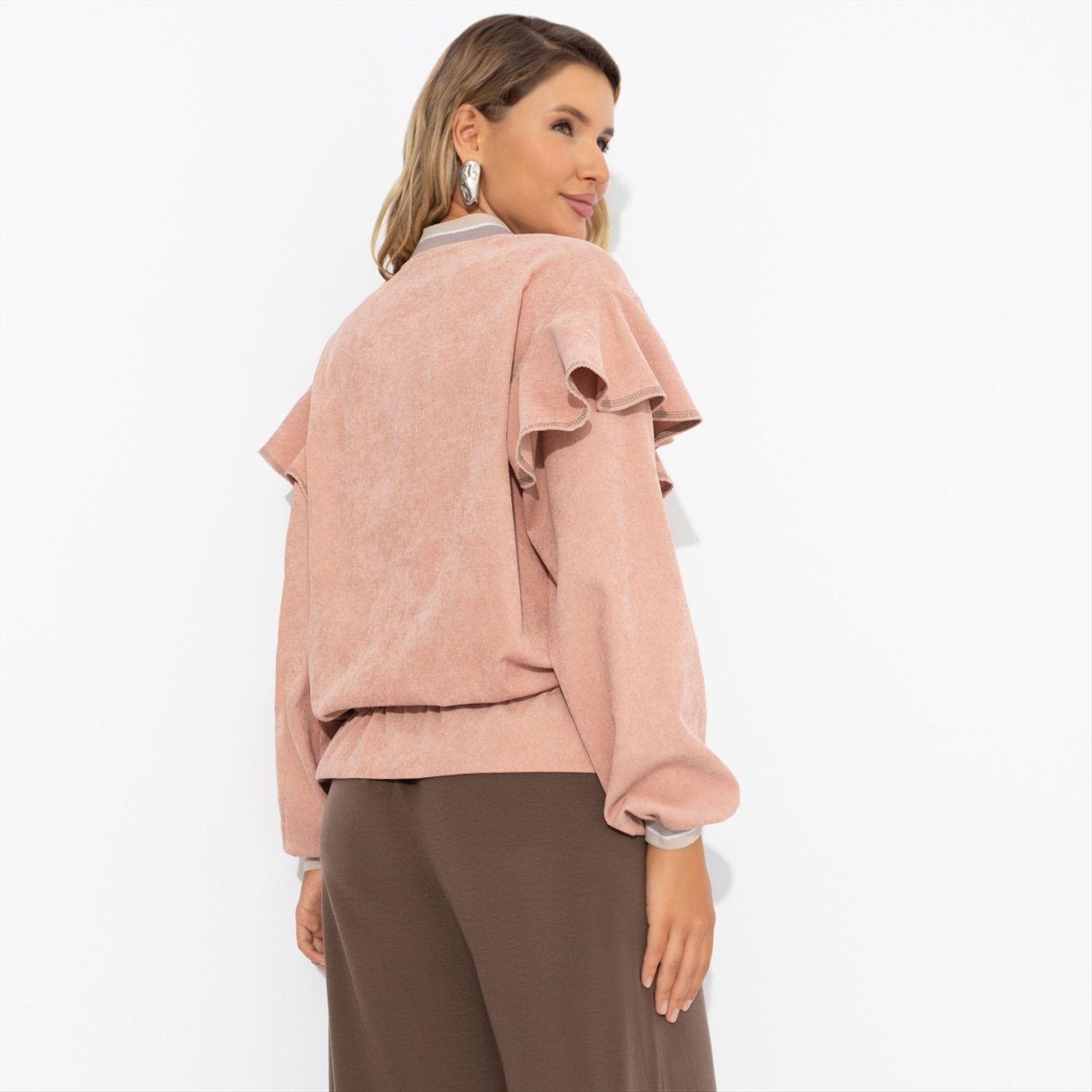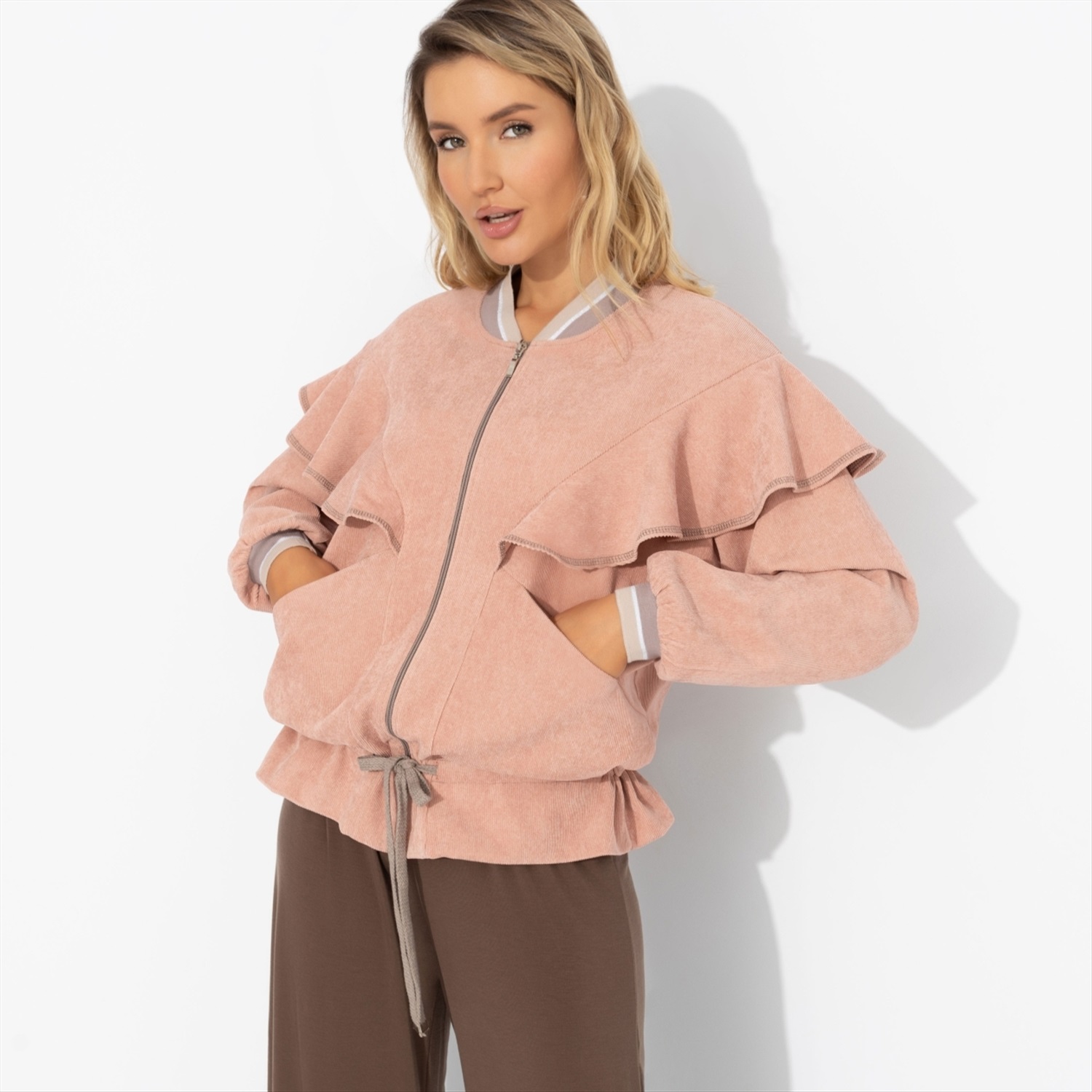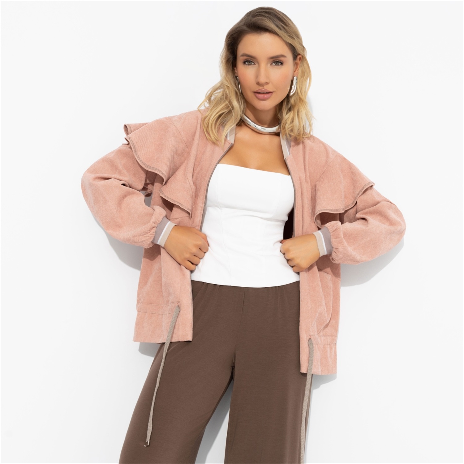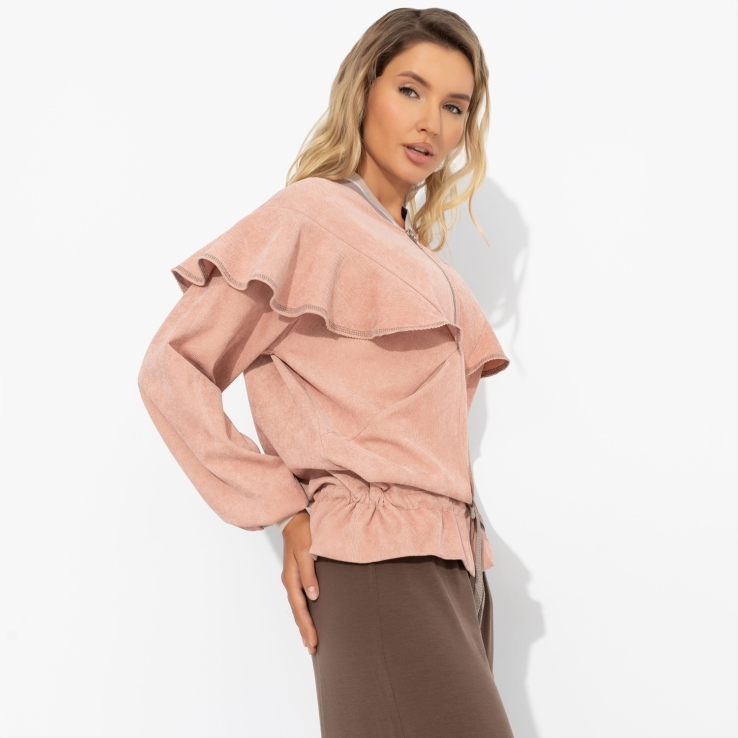 ТН ВЭД: 6202300000; Состав: Кост. ткань «вельвет» (50% хлопок, 45% п/э, 5% спандекс); Плотность ткани: Плотная; Тип ткани: Текстиль; Вид застежки: Молния; Декоративные элементы: Другое; Дополнительный цвет ткани: Коричневый; Карманы: В рельефах; Основной цвет ткани: Розовый; Отрезная талия: Нет; Подклад: Нет; Резинка по талии: Нет; Рисунок/раппорт: Нет, все изделия идентичны; Сезон: Демисезон; Силуэт: Свободный; Стиль: Повседневный