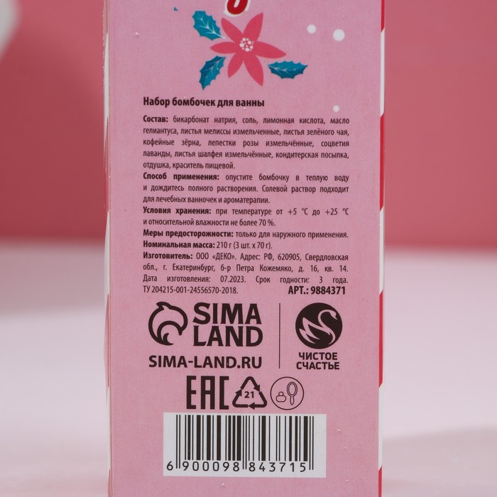 Производитель: Чистое счастье; Габариты: 12 x 4 x 4; Страна: Россия; В боксе: 94 набор; Состав: См. на упаковке; Материалы: см. на упаковке; Фасовка: по 1 набор; Индивидуальная упаковка: Плёнка; Сертификат: ЕАС; Набор: Да; Цвет: Разноцветный; Для кого: Для женщины; Форма: Куб; В наборе, шт.: 3; Вес, г/Объём, мл: 70; Вес, г: 70; Тематика: Новогодняя; Вид упаковки: Коробка картонная; Символ года: Нет; Тематика праздника: Новый год; Адресат: Без адресата; Возраст: Взрослый; Область применения: Для тела; Аромат: Ягоды; Составляющие набора: Бомбочка для ванн; Возраст: Для взрослых; Возраст: Для всех возрастов; Назначение: Тонизирование; Особенности: С сухоцветом