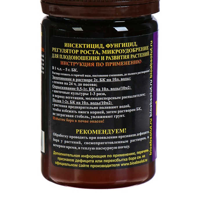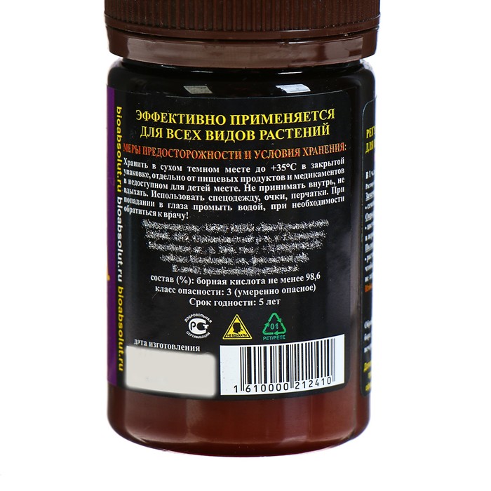 Борная кислота это универсальное микроудобрение для плодовых, овощных, ягодных и цветочных культур, применяемое при дефиците бора в почве. Бор оказываеь большое влияние на синтез углеводов, их превращение и передвижение в растениях, формирование репродуктивных органов, оплодотворение, рост корневой системы, окислительно-восстановительные процессы, белковый и нуклеиновый обмен, на синтез и передвижение стимуляторов роста. Поглощение растениями бора увеличивает потребление других питательных веществ. При недостатке бора замедляется рост растений, отмирают точки роста побегов и корней, не раскрываются бутоны, отпадают цветки, появляются трещины, органы растений чернеют и приобретают неправильную форму. Борная кислота содержит микроэлемент бор, необходимый растениям в течение всего вегетационного периода.