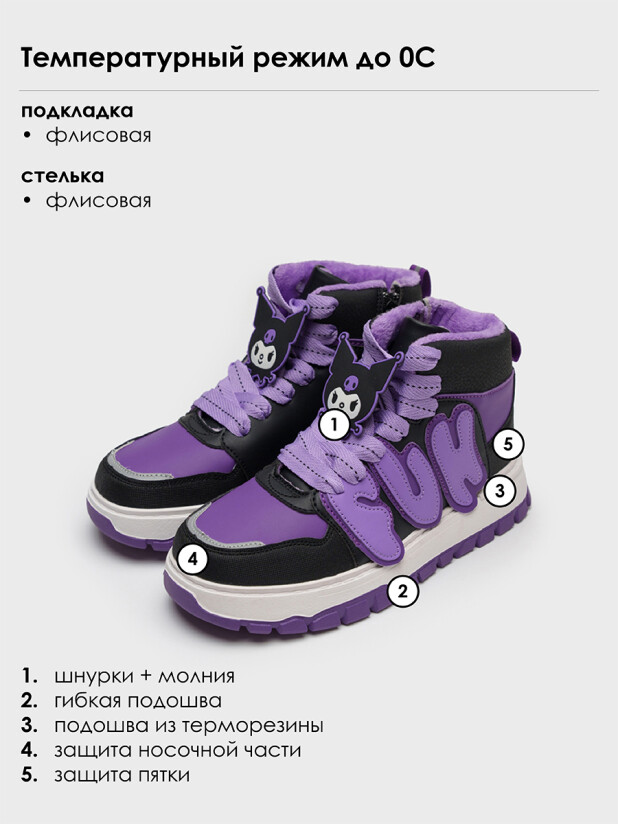 Кроссовки для девочки подростка. Стильные ботинки выполнены из искусственной кожи, обладающей высокими эксплуатационными свойствам. Носочная и пяточная части усилены специальным защитным материалом. Подкладка и съемная стелька выполнены из мягкого флиса. Формоустойчивый задник поддерживает стопу в правильном положении. Эргономичная форма колодки обеспечивает правильное формирование стопы ребенка. Ботинки имеют широкие шнурки и молнию изнутри. На шнурках имеется съемная клипса-фурнитура с Куроми. Модель имеет светоотражающие элементы. Двухсоставная подошва из терморезины очень гибкая, не скользит и устойчива к истиранию. Рекомендованный температурный режим ( зависит от активности ребенка и поддевы под обувь) от +10°С до 0°С. Кроссовки демисезонные отлично подойдут для прогулок осенью и ранней весной (осень, весна). Модель из капсульной коллекции UNICORN KUROMI (ЮНИКОРН КОРОМИ). Соберите полный образ в едином стиле!