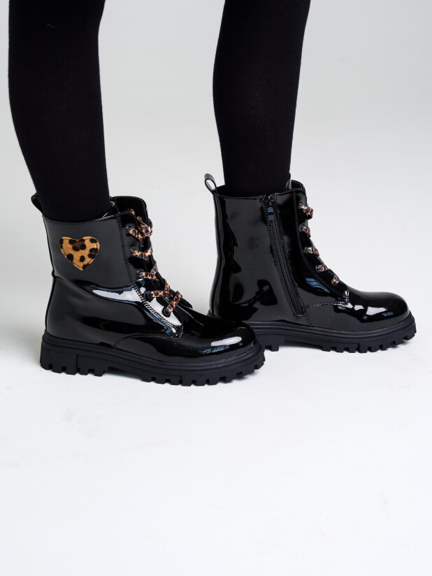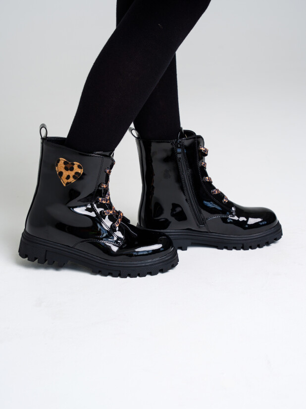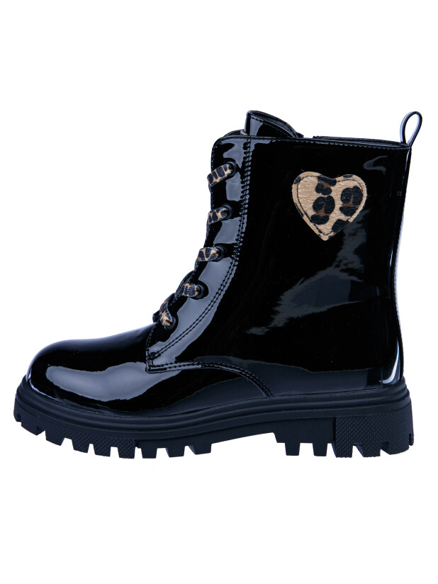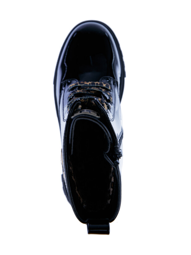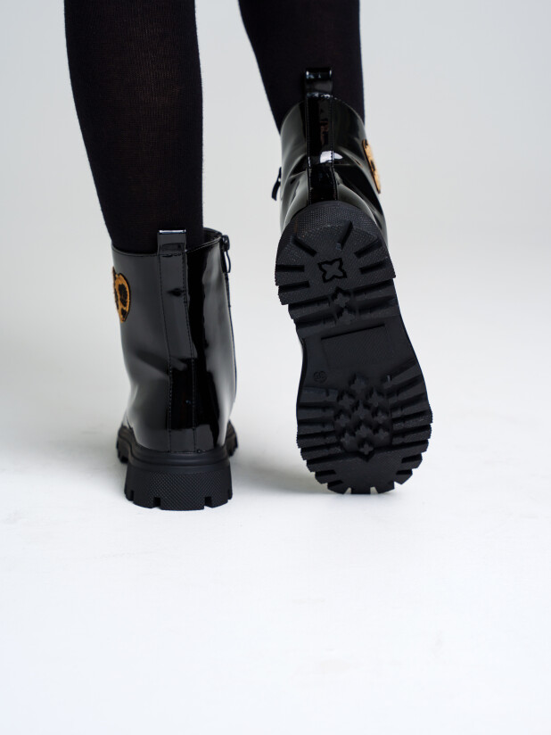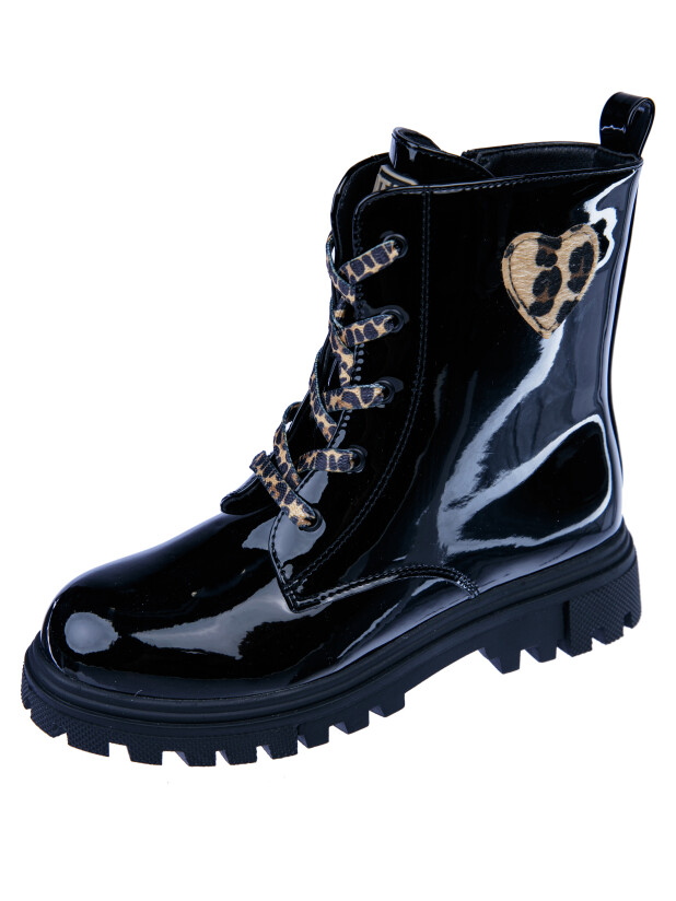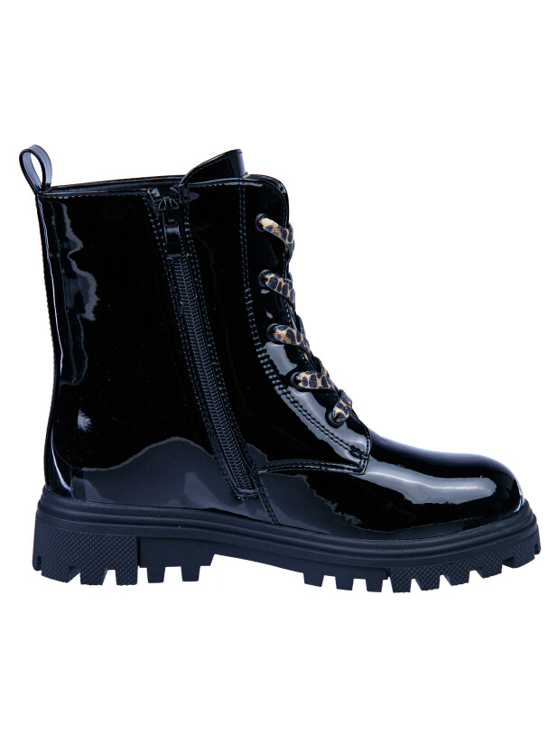Верх обуви выполнен из искусственной лаковой кожи. Подкладка и стелька выполнены из мягкого флиса. Формоустойчивый задник поддерживает стопу в правильном положении. Удобная колодка. Застежка на молнию и шнурки. Подошва не скользит и устойчива к истиранию. Рекомендованный температурный режим от +10°С до -5°С.