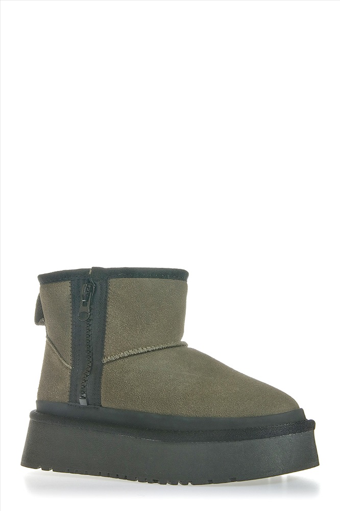 Унты выполнены из натуральной замши, верх оформлен объемными швами. Задник укреплен вставкой и дополнен логотипом бренда. Внутренняя отделка из натуральной шерсти.