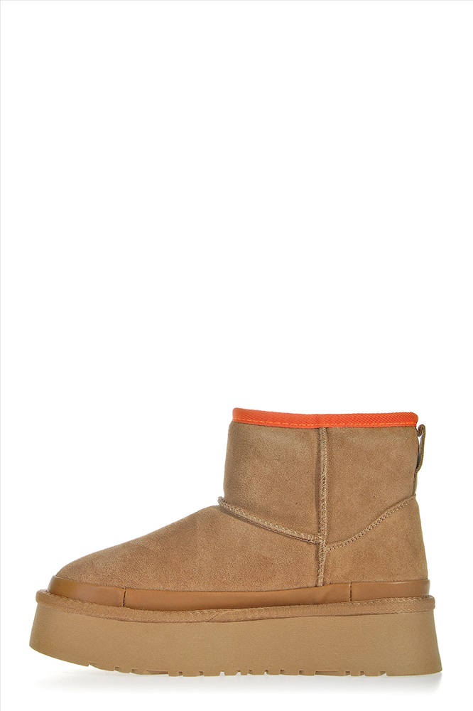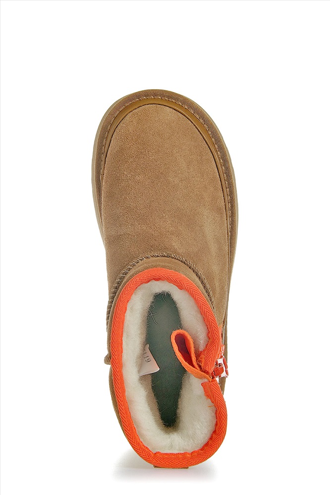 Унты выполнены из натуральной замши, верх оформлен объемными швами. Задник укреплен вставкой и дополнен логотипом бренда. Внутренняя отделка из натуральной шерсти.