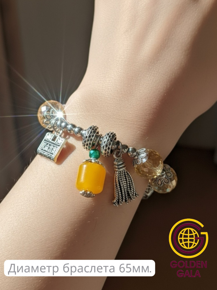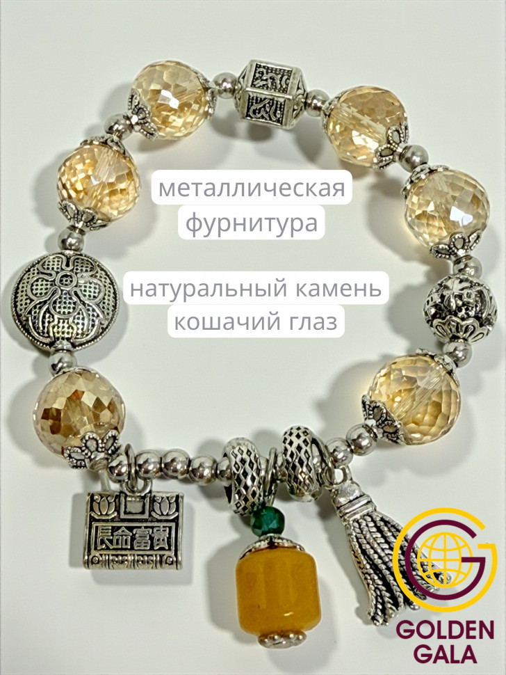 Фурнитура цвета чёрного серебра придаёт украшению современный и стильный вид, а декоративные висюльки делают его ещё более выразительным. Особую загадочность браслету придаёт камень «кошачий глаз», который, словно живой, переливается таинственными бликами.