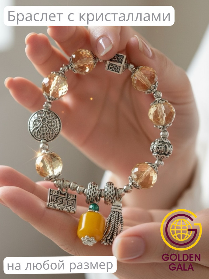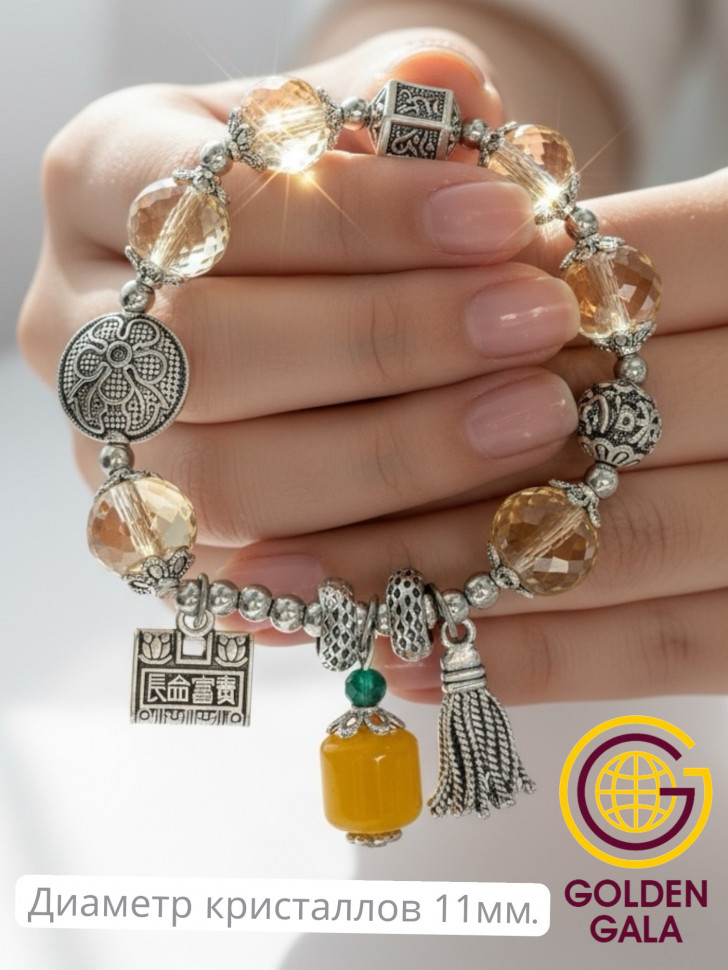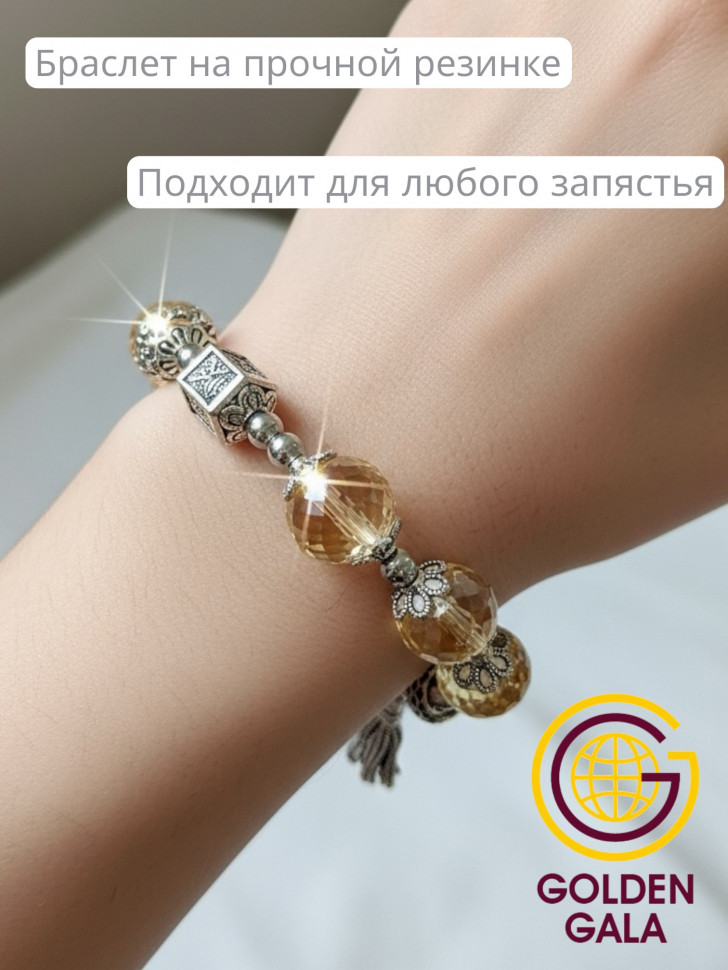 Позвольте себе окунуться в мир роскоши и элегантности с женственным браслетом от бренда Goldengala. Его главное очарование – крупные, переливающиеся бусины из хрусталя диаметром 11 мм, которые играют светом, создавая завораживающий эффект. Каждая бусина – как капля волшебства, добавляющая образу блеск и утончённость.