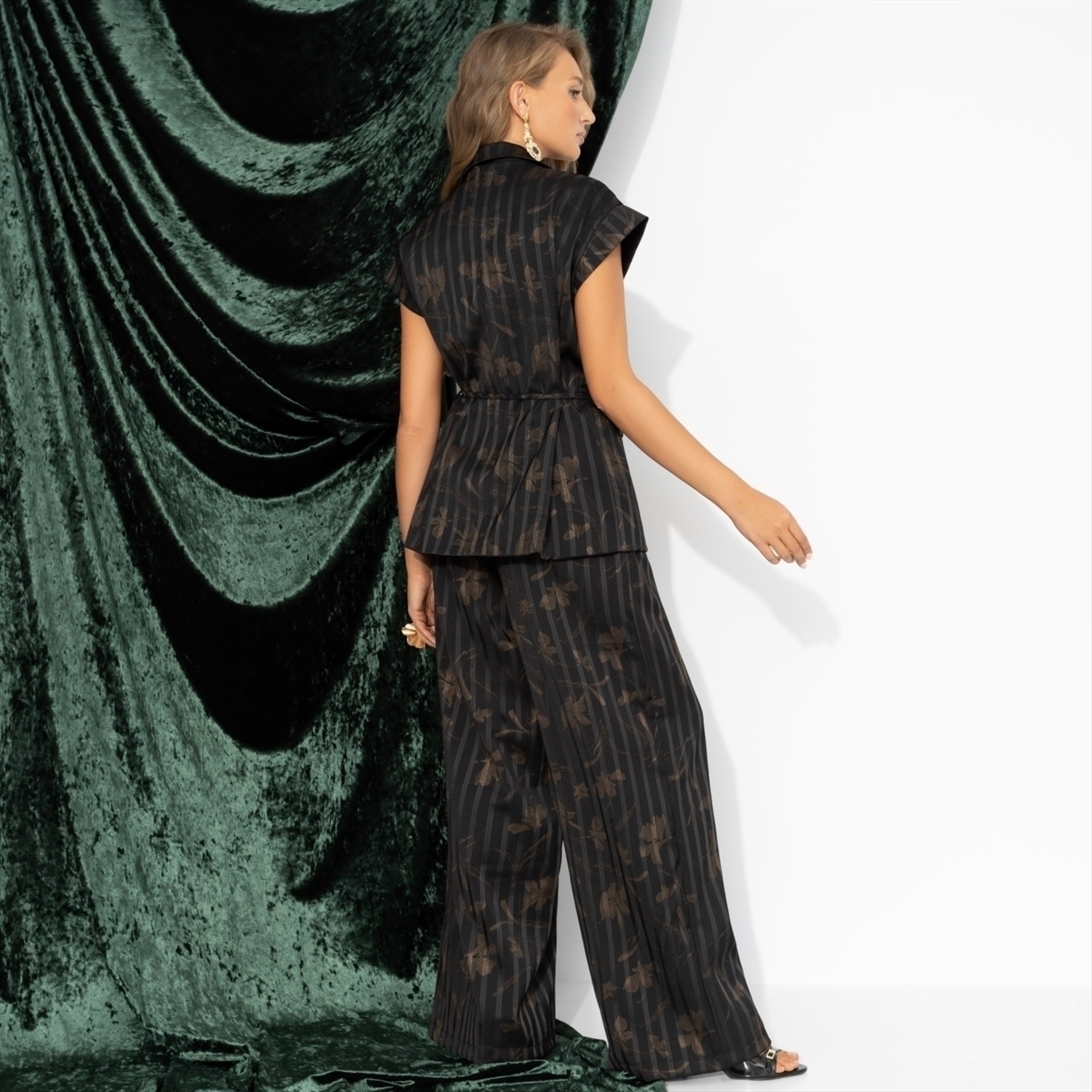 Деловой завтрак в отеле. Ты открываешь ноутбук, делаешь глоток кофе и улыбаешься – контракт уже твой. Костюм с безупречной посадкой говорит о статусе без слов. Комплект из жилета и широких брюк. Брюки на высокой посадке, с застёжкой на молнию. Жилет двубортный с поясом, акцентные плечи.