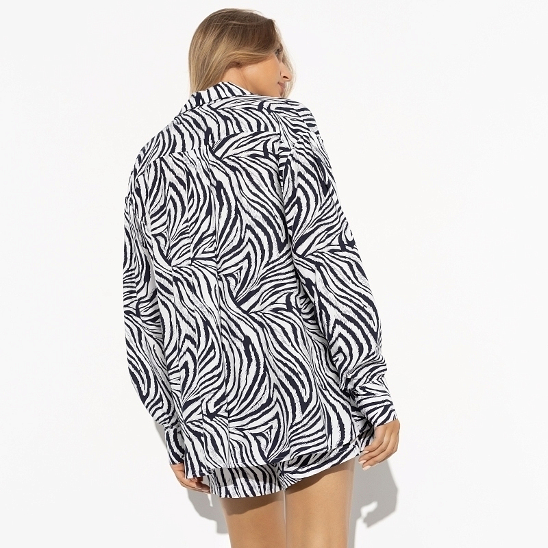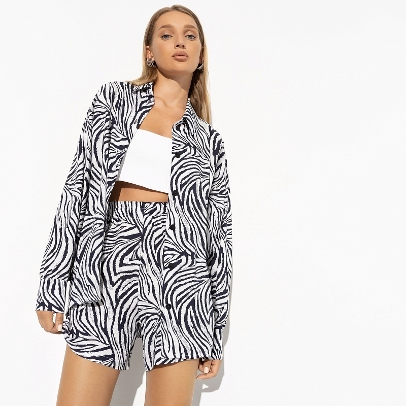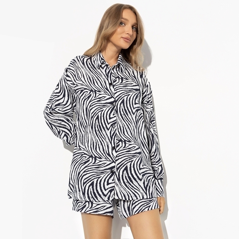 Его мечтой было носить рубашку с шортами в трендовой расцветке «зебра», но исполнилось она у тебя. Так распорядилась сама Госпожа Мода. Ничего с этим не поделать, остается подчиниться. Его задача – любоваться тобой. В составе комплекта шорты с высокой посадкой на резинке. Рубашка свободного кроя на пуговицах. Комплект из 100% вискозы.