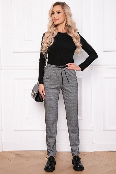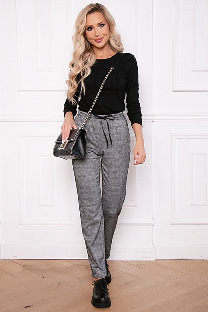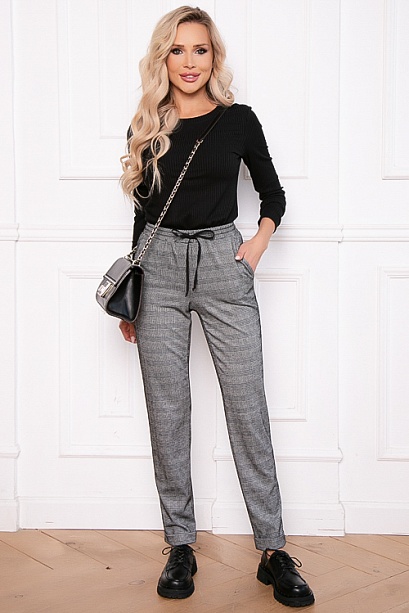 Комфортные брюки из трикотажного полотна в клетку.В боковых швах функциональные карманы,удобную посадку по талии обеспечивает эластичный пояс на резинке с кулиской. 50% вискоза,45% п/э,5% лайкра Комментарии к товару