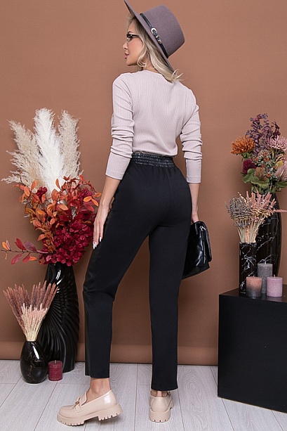 Комфортные комбинированные брюки из экокожи и трикотажа джерси в черном цвете.В боковых швах функциональные карманы,удобную посадку по талии обеспечивает эластичный пояс на резинке,за счет спинки из трикотажного полотна брюки становятся еще более удобны в носке.