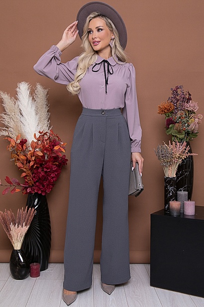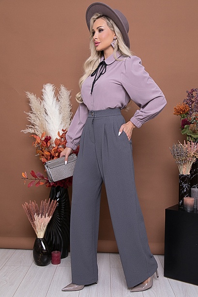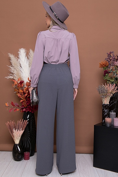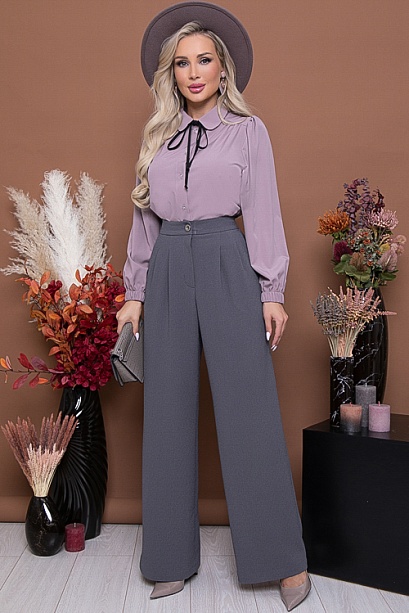 Брюки-палаццо из комфортной костюмной ткани,с высокой посадкой по талии,застегивающиеся на молнию в гульфике.По переду от пояса застрочены мягкие складки.В боковых швах функциональные карманы.Пояс притачной,застегивающийся на одну пуговицу,посаженный по спинке на резину. 75% вискоза,20% п/э,5% лайкра Комментарии к товару