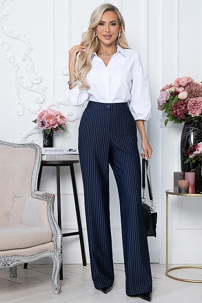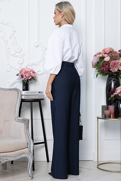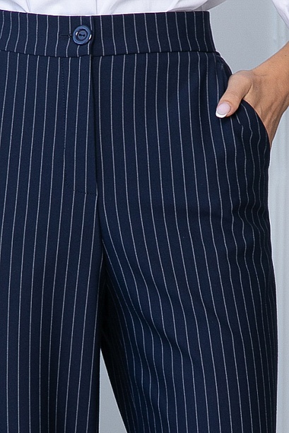 • Брюки из плотного хорошо держащего форму  трикотажного полотна в полоску, с высокой посадкой по талии  застегивающиеся на молнию в гульфике. Пояс притачной с застежкой на пуговицу. Для удобства в носке пояс по спинке собран на резину. По бокам подрезные функциональные карманы