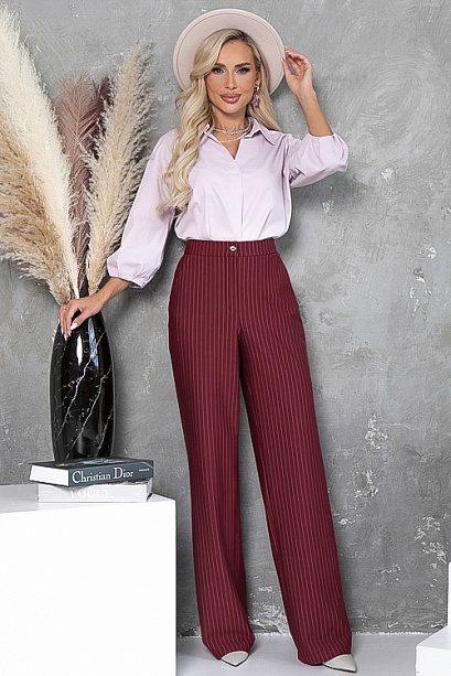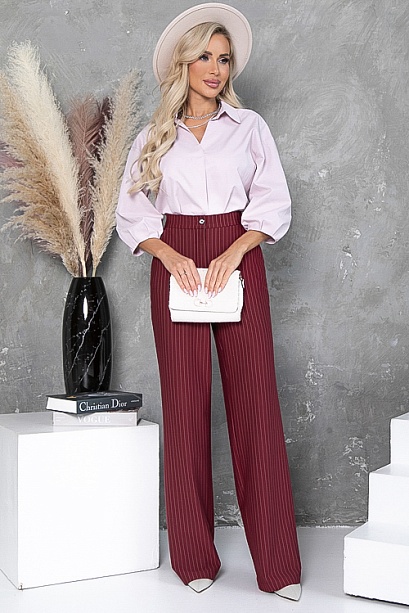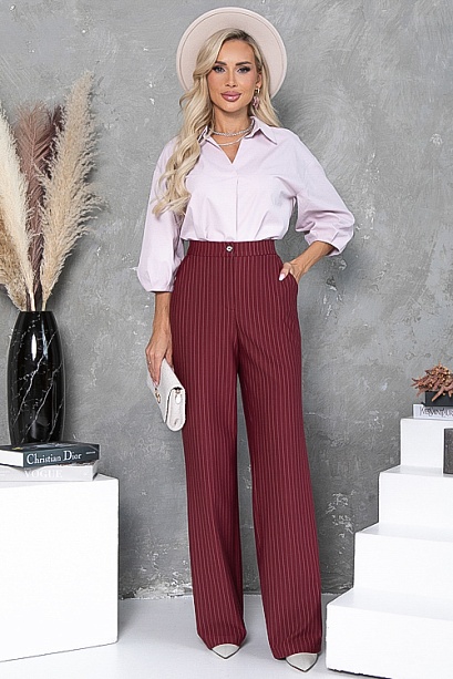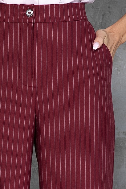 • Брюки из плотного хорошо держащего форму  трикотажного полотна в полоску, с высокой посадкой по талии  застегивающиеся на молнию в гульфике.Пояс притачной с застежкой на пуговицу. Для удобства в носке пояс по спинке собран на резину. По бокам подрезные функциональные карманы.