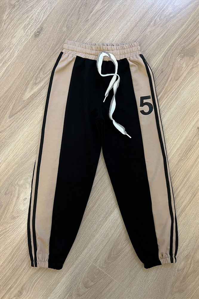 Застежка: без застежки Брюки черные спортивные с бежевыми вставками для детей из трикотажного полотна. Штаны на поясе из эластичного трикотажа с резинкой внутри, низ брюк на манжете из эластичного трикотажа.
