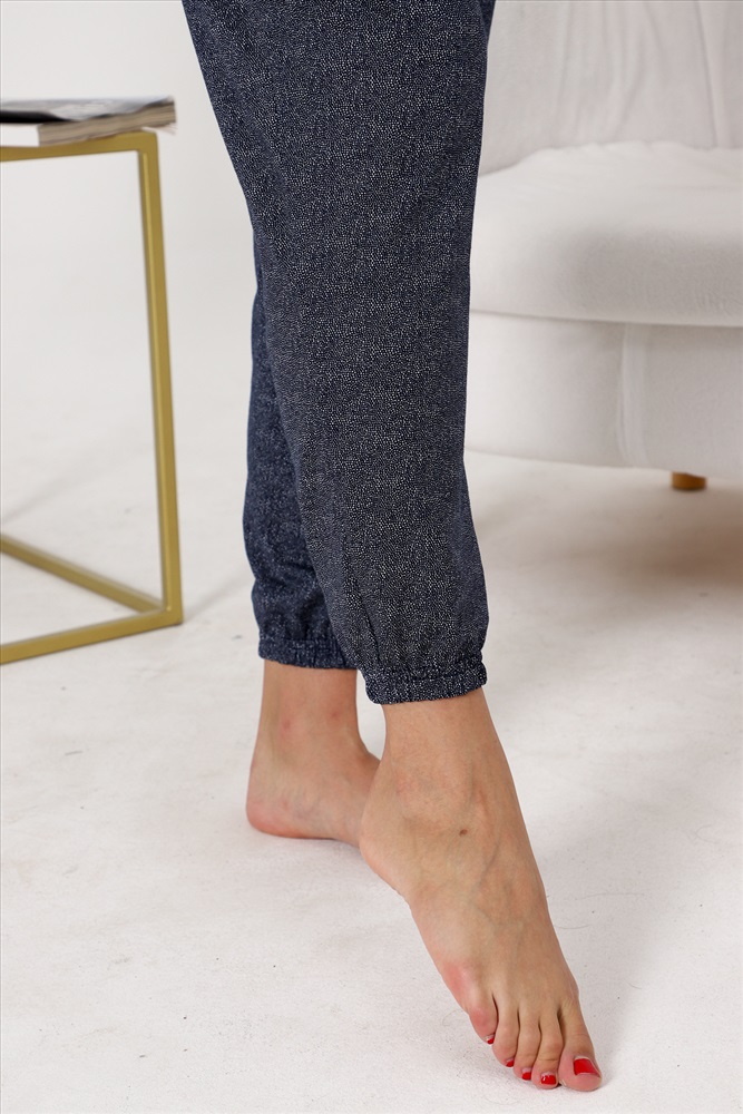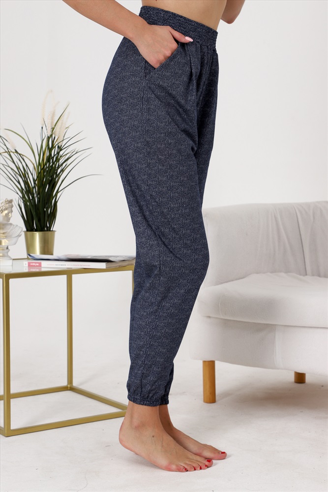 Брюки свободные, на поясе, с боковыми карманами. В верхней части передних половинок, по шву притачивания пояса, расположены складки. Низ брюк собран на резинку.