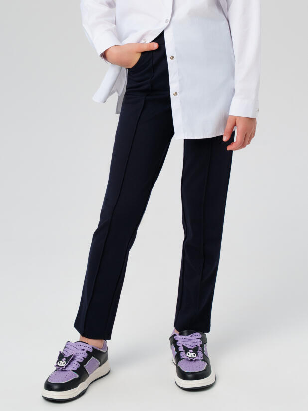 Посадка regular fit гарантирует комфорт и свободу движений, сохраняя при этом аккуратный и строгий внешний вид. Эластичный пояс на мягкой резинке легко подстраивается под фигуру ребёнка, а имитация застёжки делает такие универсальные темно-синие брюки для подростков более элегантными. Практичные боковые карманы предназначены для необходимых мелочей, а декоративные строчки спереди подчёркивают классический стиль модели.