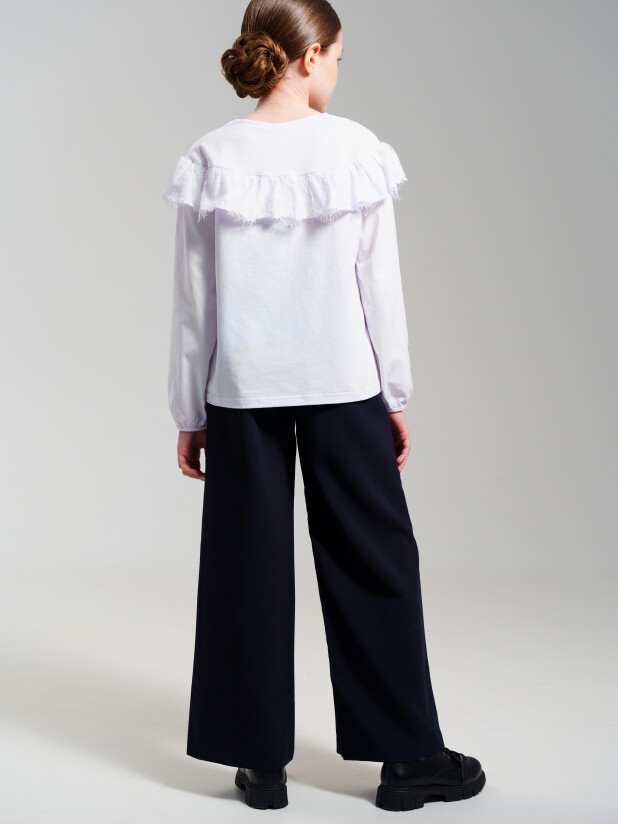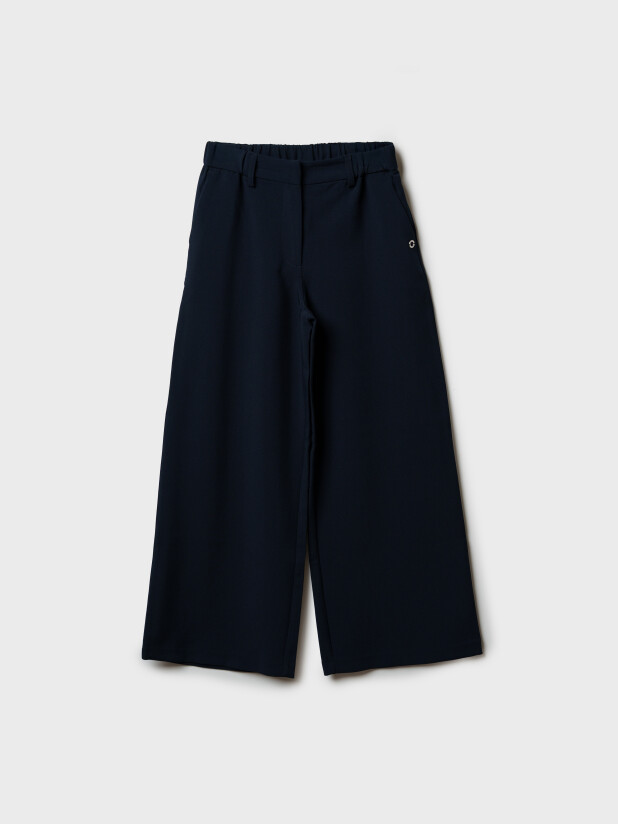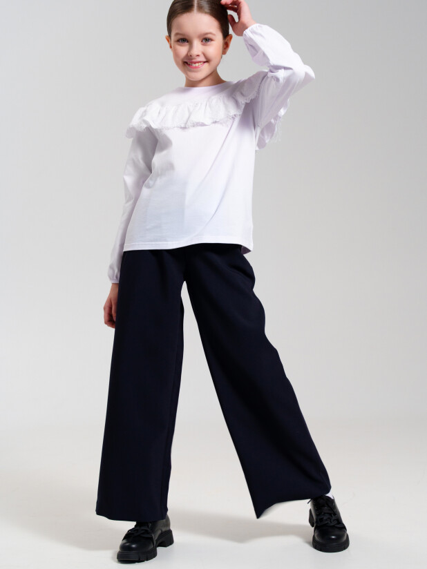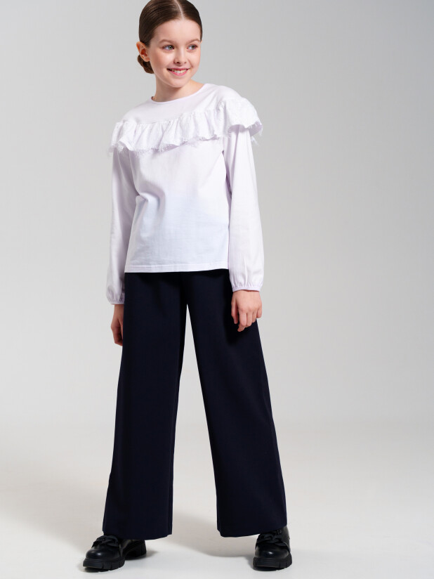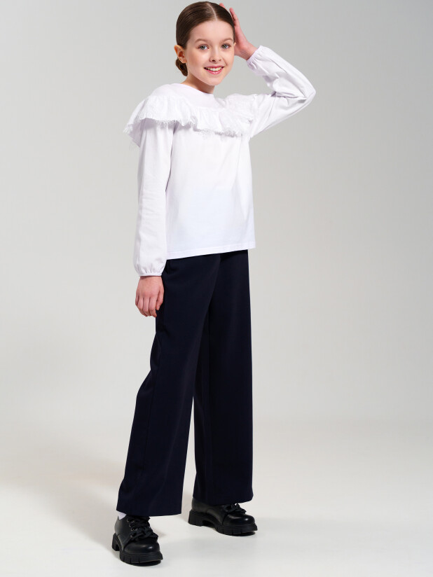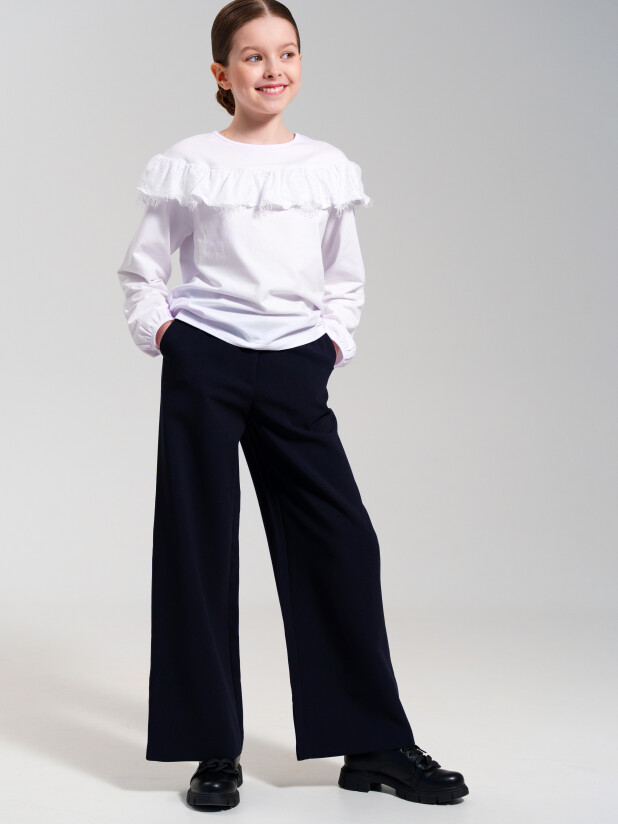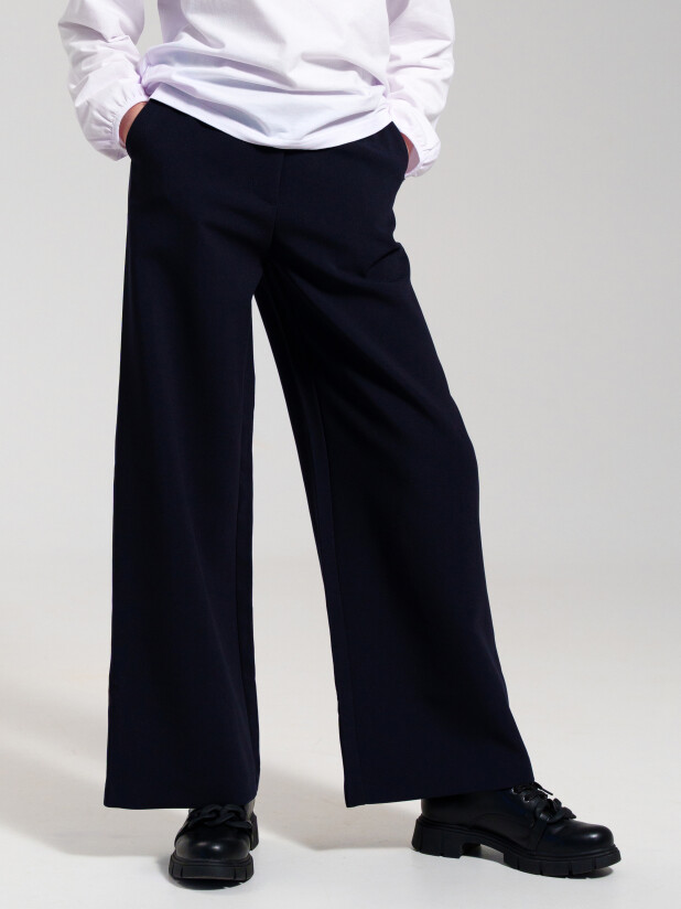 Школьные синие текстильные брюки non-iron свободного силуэта для девочки подростка от PlayToday — идеальный вариант для комфортной и опрятной школьной формы. Универсальная модель подойдёт и для повседневных занятий, и для особых школьных событий.