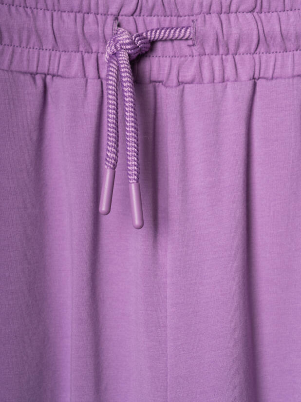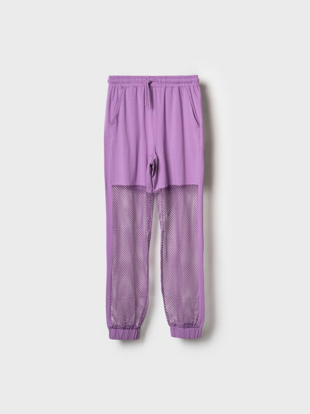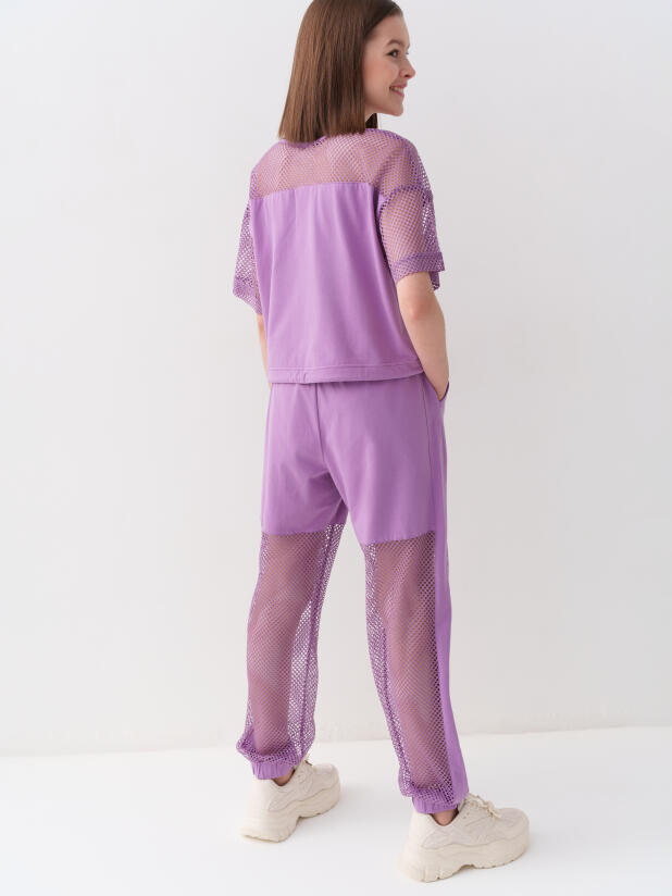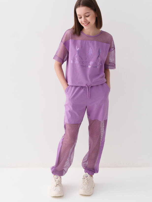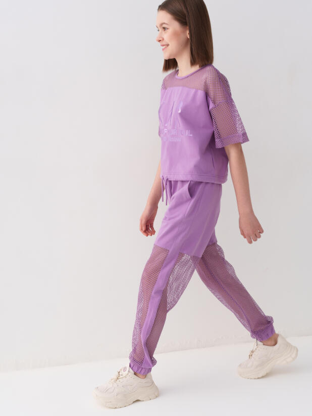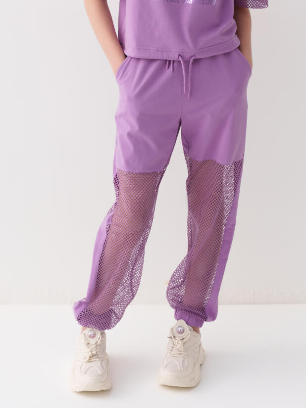 Стильные брюки для девочки подростка. Верхняя часть выполнена из плотного хлопкового трикотажа, а нижняя — из легкой прозрачной сетки, создающей модный контраст и эффект "двойного слоя". Брюки имеют эластичный пояс со шнурком и удобные боковые карманы. Низ брючин собран на резинку, благодаря чему брюки хорошо сидят по фигуре. По бокам и передней части расположены лампасы, добавляющие спортивный акцент.