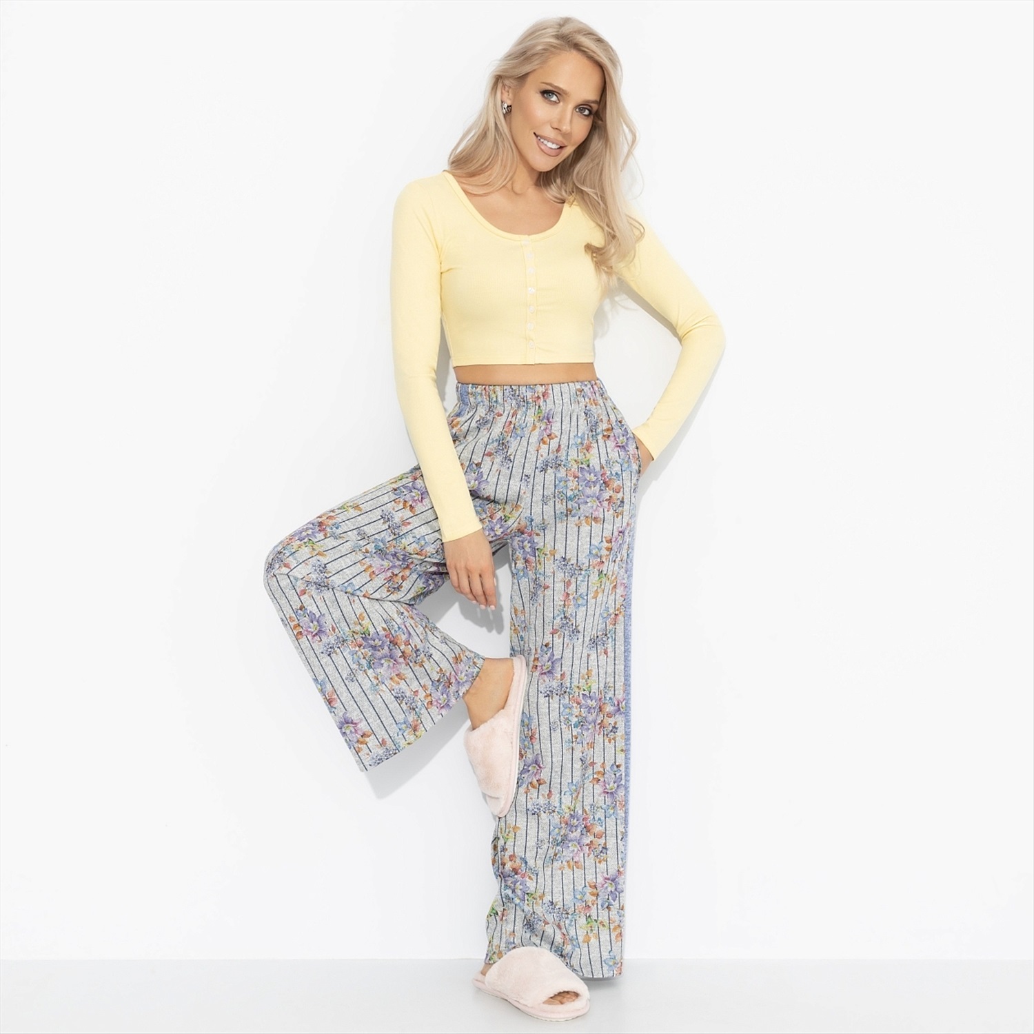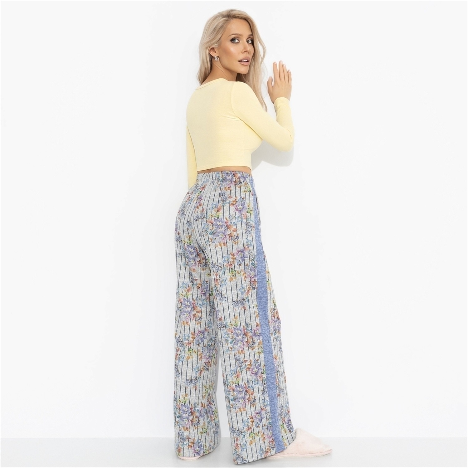 ТН ВЭД: 6104630000; Состав: Трикотаж «меланж» (65% п/э, 30% вискоза, 5% спандекс); Плотность ткани: Плотная; Тип ткани: Трикотаж; Вид застежки: Нет; Декоративные элементы: Контрастная отделка; Дополнительный цвет ткани: Голубой; Карманы: Накладные; Основной цвет ткани: Серый; Подклад: Нет; Резинка по талии: Есть; Рисунок/раппорт: Нет, все изделия идентичны; Сезон: Круглогодичный; Стиль: Бельевой; Фасон брюк: Широкие