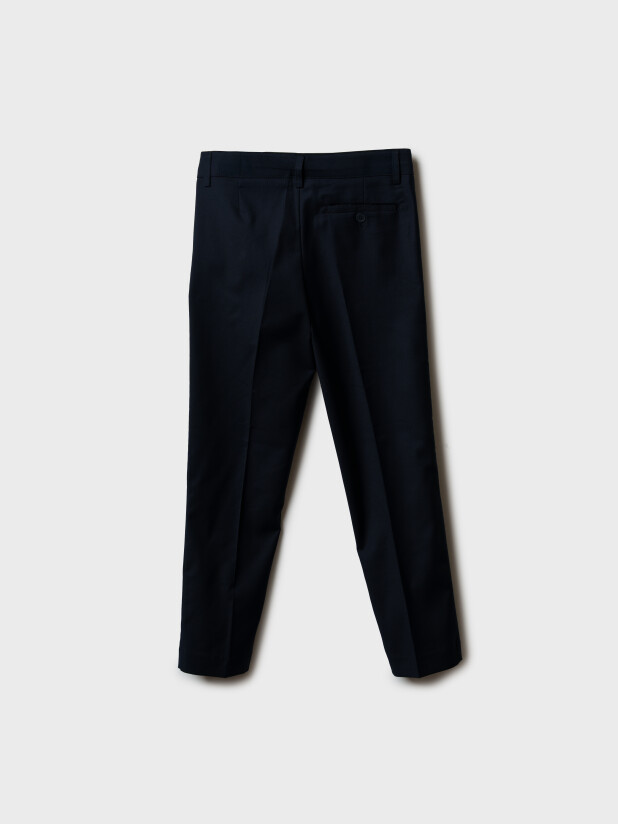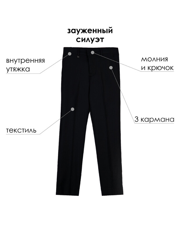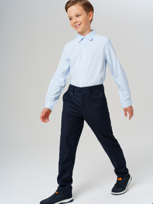Школьные текстильные брюки для мальчика подростка. Брюки (штаны) облегающего силуэта идеально подойдут в школу. Классические синие брюки для школы выполнены из костюмной ткани с содержанием вискозы, что обеспечивает максимальный комфорт во время занятий. Брюки имеют функциональные карманы в боковых швах, что очень удобно для школьника. Застежка на молнию и пуговицу. Внутренняя утяжка по поясу.