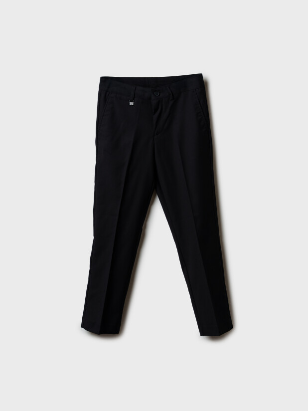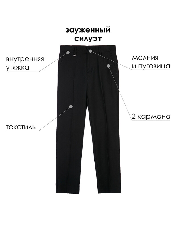 Облегающий силуэт - slim fit - создаёт аккуратный и стильный образ, который идеально подойдёт для школы и торжественных мероприятий. Эти классические штаны для мальчиков в школу имеют удобную застёжку на молнию и пуговицу, обеспечивающую надёжную посадку. Боковые карманы добавляют функциональности и практичности в повседневной носке.