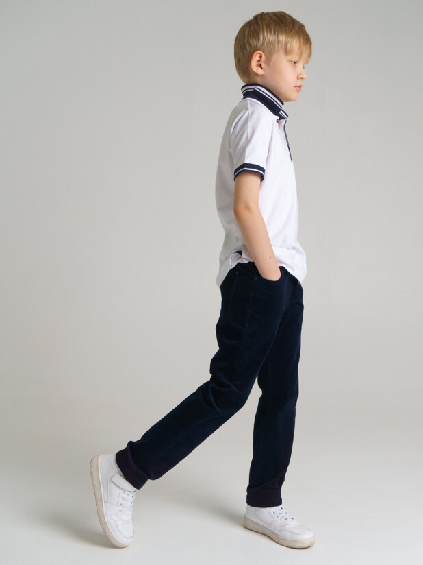 Школьные текстильные брюки для мальчика подростка. Брюки (штаны) классического силуэта идеально подойдут в школу. Классические синие брюки для школы выполнены из вельвета. Брюки имеют функциональные карманы в боковых швах, что очень удобно для школьника. Застежка на молнию и кнопку. Внутренняя утяжка по поясу.