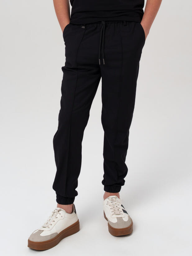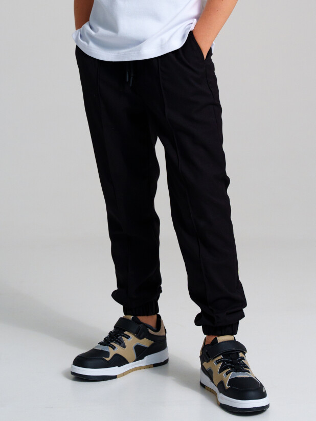 Эти черные подростковые брюки джоггеры для мальчика в школу выполнены из комфортной текстильной ткани с добавлением вискозы. Материал приятный на ощупь, хорошо пропускает воздух и обеспечивает максимальный комфорт в течение всего дня. Полиэстер в составе повышает прочность и устойчивость к износу, а эластан дарит лёгкую эластичность и свободу движений.