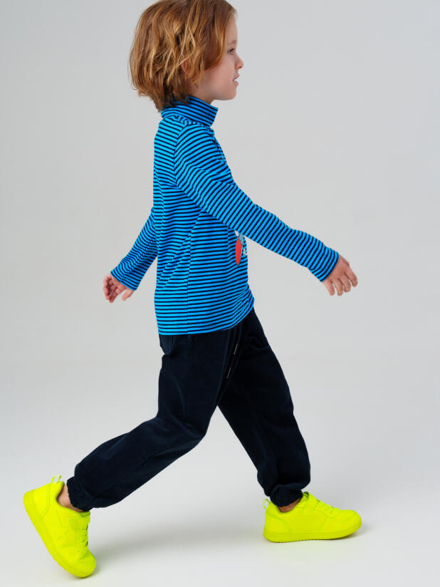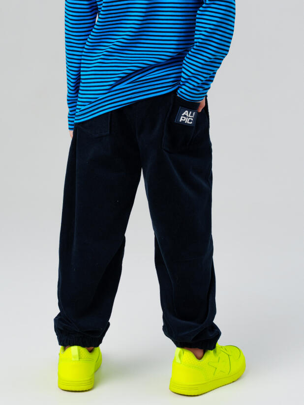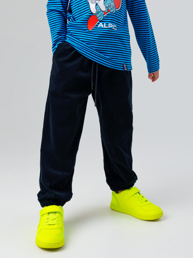 Классические тёмно-синие брюки из вельвета для мальчика от PlayToday — универсальная и комфортная модель для детского гардероба. Выполнены из мягкого хлопкового вельвета с добавлением эластана — материал приятен к телу, хорошо тянется и сохраняет форму. Эластичный пояс с утяжкой и свободный крой обеспечивают комфортную посадку и свободу движений, а манжеты по низу брюк не дают ткани задираться во время игр и прогулок.
