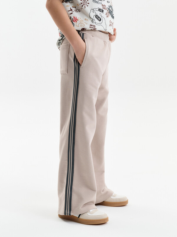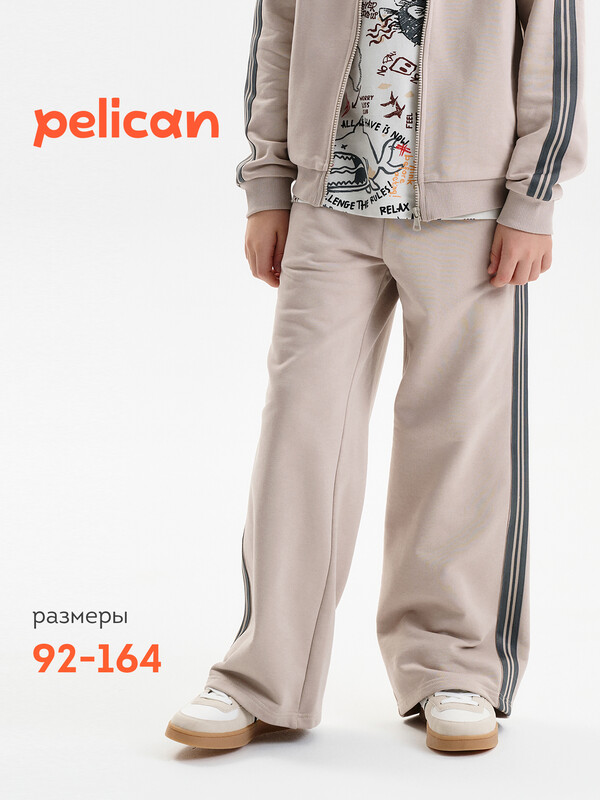 Широкие прямые брюки для мальчика из футера плотностью 350 гр/кв.м. Карманы в боковых швах. На задней половинке брюк справа накладной карман. Пояс из основной ткани, внутри широкий эластик, прострочен двумя строчками. В поясе внутренняя утяжка на шнурок. По бокам трикотажные лампасы.