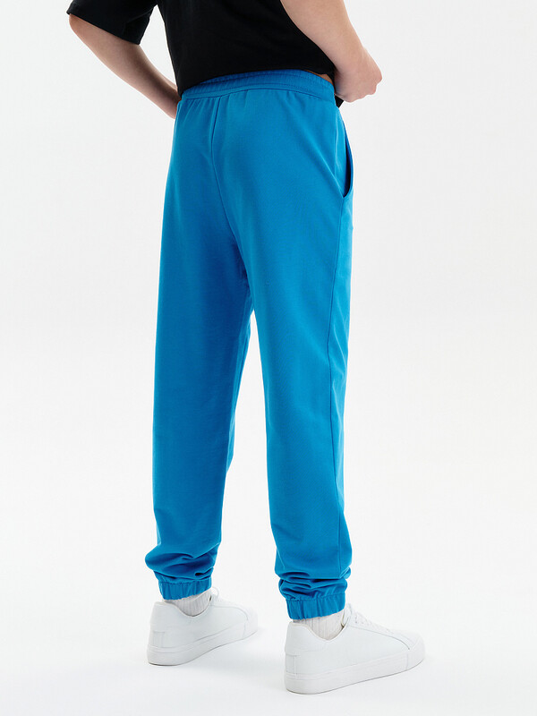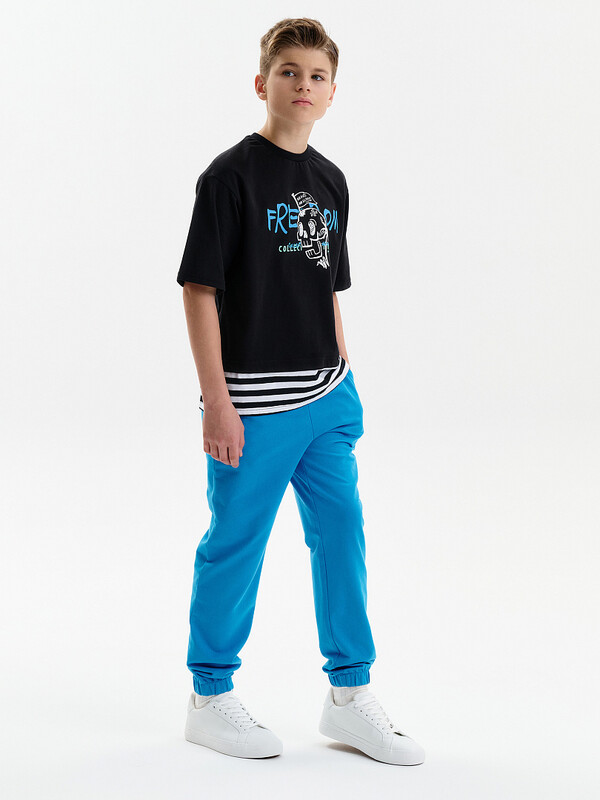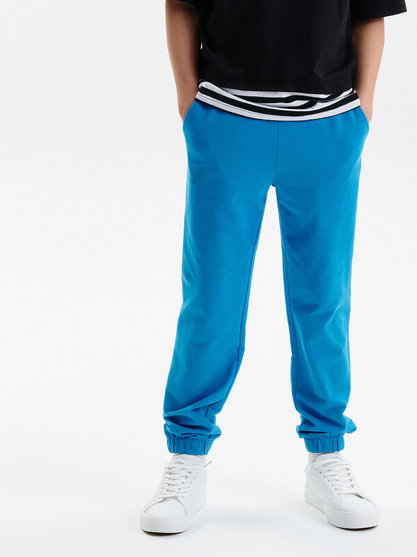 Брюки для мальчика на резинке из тонкого трикотажа. Комфортные спортивные штаны для мальчика свободного силуэта, по низу брюк тунельная резина. Пояс из основной ткани, внутри широкий эластик, прострочен двумя строчками. Брюки с карманами выполнены из футера. Внутренняя утяжка по поясу шнурком.