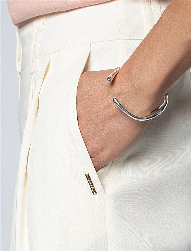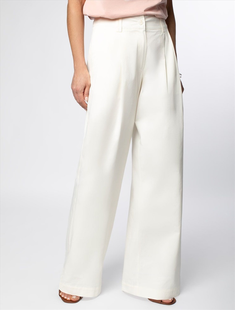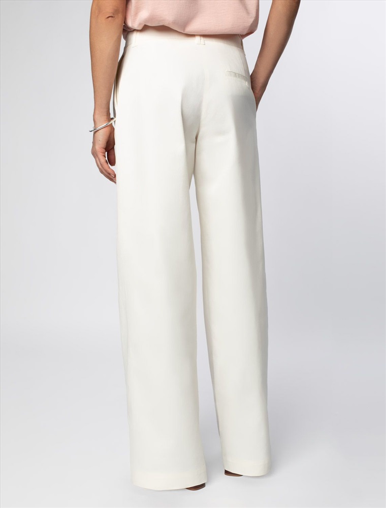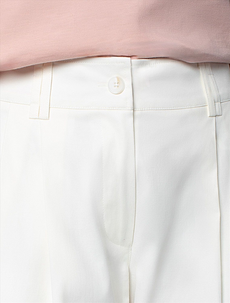 Брюки выполнены из хлопкового твила. Изделие дополнено двумя вариантами шлёвок, что позволяет использовать ремни разной ширины. Модель имеет два боковых и один задний карман. Защипы у пояса и стрелки вдоль брючины визуально вытягивают силуэт и подчеркивают талию. Благодаря наличию эластана в составе изделие сохранит свой безупречный внешний вид в течение долгого времени. Обладает высокой воздухопроницаемостью, в брюках будет комфортно даже в жаркое время года.