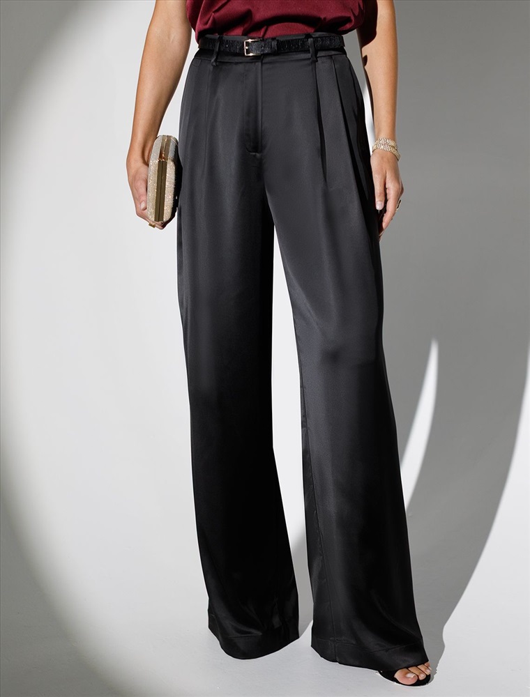 Брюки палаццо черного цвета из струящегося сатина, который придает образу эффектный и стильный вид. Мягкий сатин приятен к телу, в них комфортно на протяжении долгой носки. Брюки длиной в пол визуально вытягивают силуэт и подходят как для высоких, так и для женщин низкого роста. Модель идеально садится на большие размеры, не сковывая движений. Благородный материал обеспечивает не только привлекательный внешний вид, но и ощущение легкости в носке. Высокая посадка выгодно подчеркивает фигуру, добавляя изящества и современного шарма, они струятся при каждом движении.