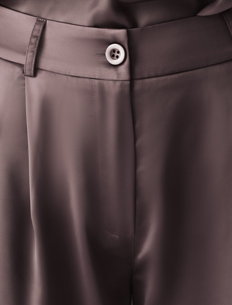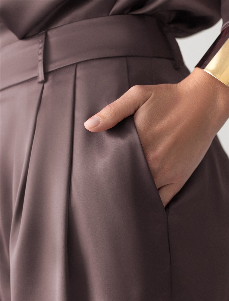 Брюки палаццо кофейного цвета из струящегося сатина, который придает образу эффектный и стильный вид. Мягкий сатин приятен к телу, в них комфортно на протяжении долгой носки. Брюки длиной в пол визуально вытягивают силуэт и подходят как для высоких, так и для женщин низкого роста. Модель идеально садится на большие размеры, не сковывая движений. Благородный материал обеспечивает не только привлекательный внешний вид, но и ощущение легкости в носке. Высокая посадка выгодно подчеркивает фигуру, добавляя изящества и современного шарма, они струятся при каждом движении.