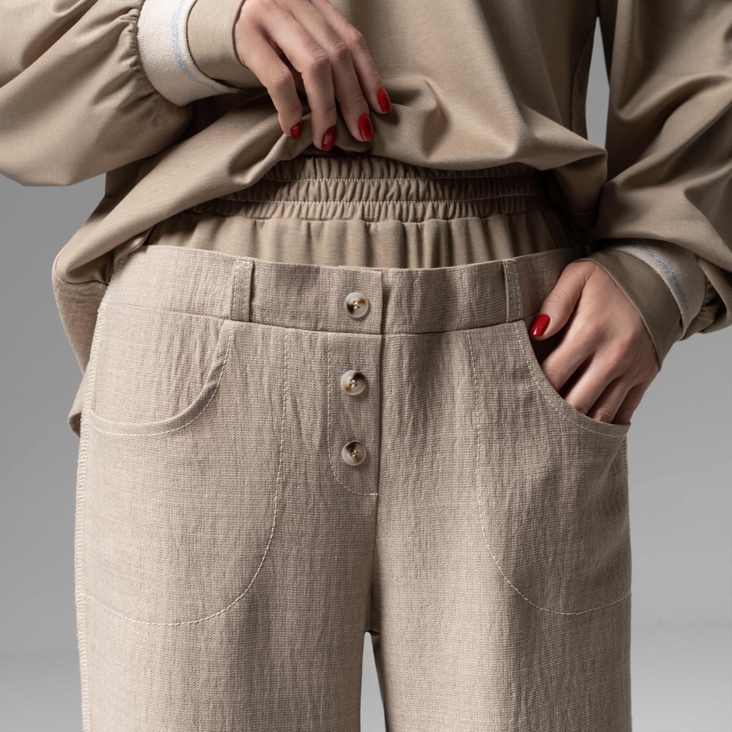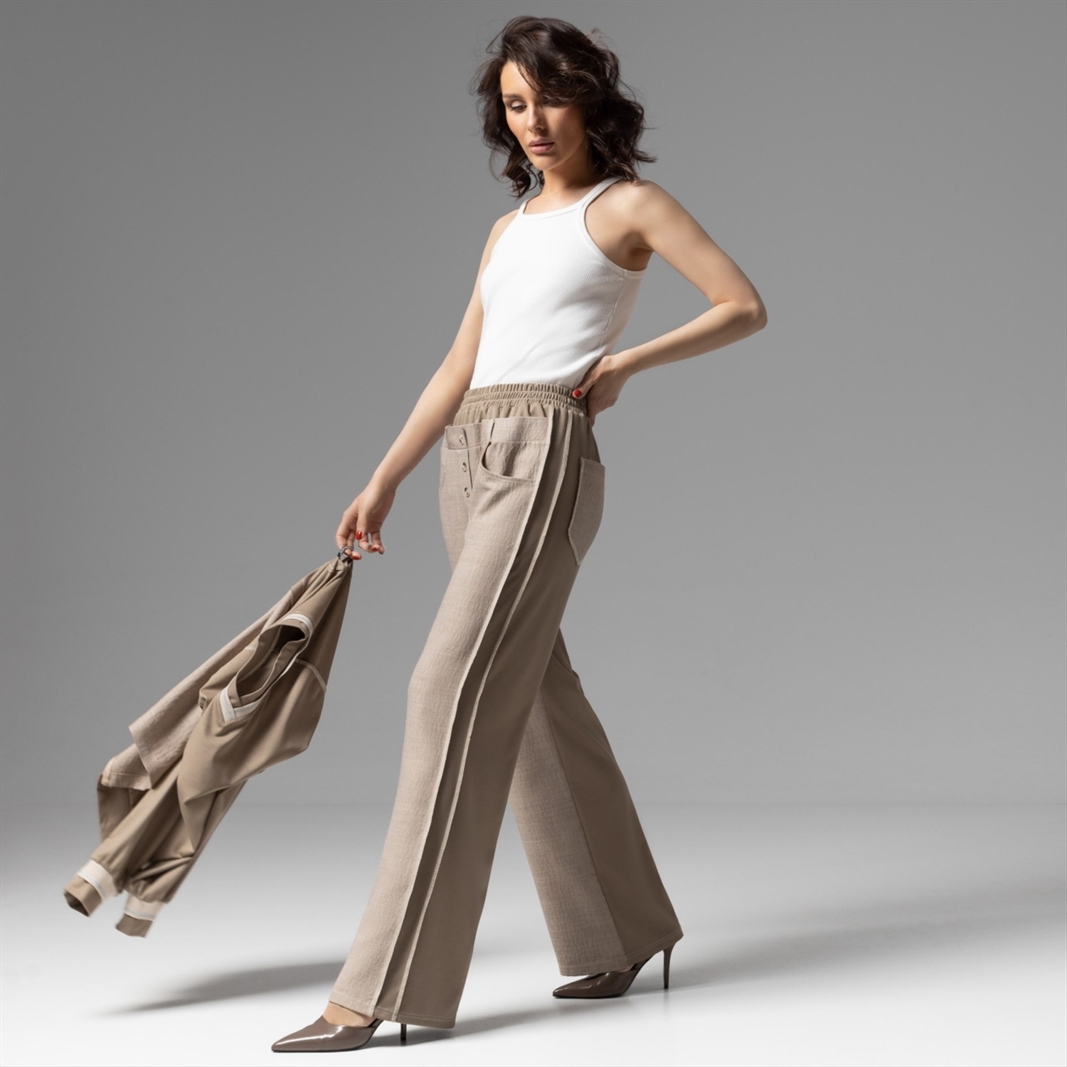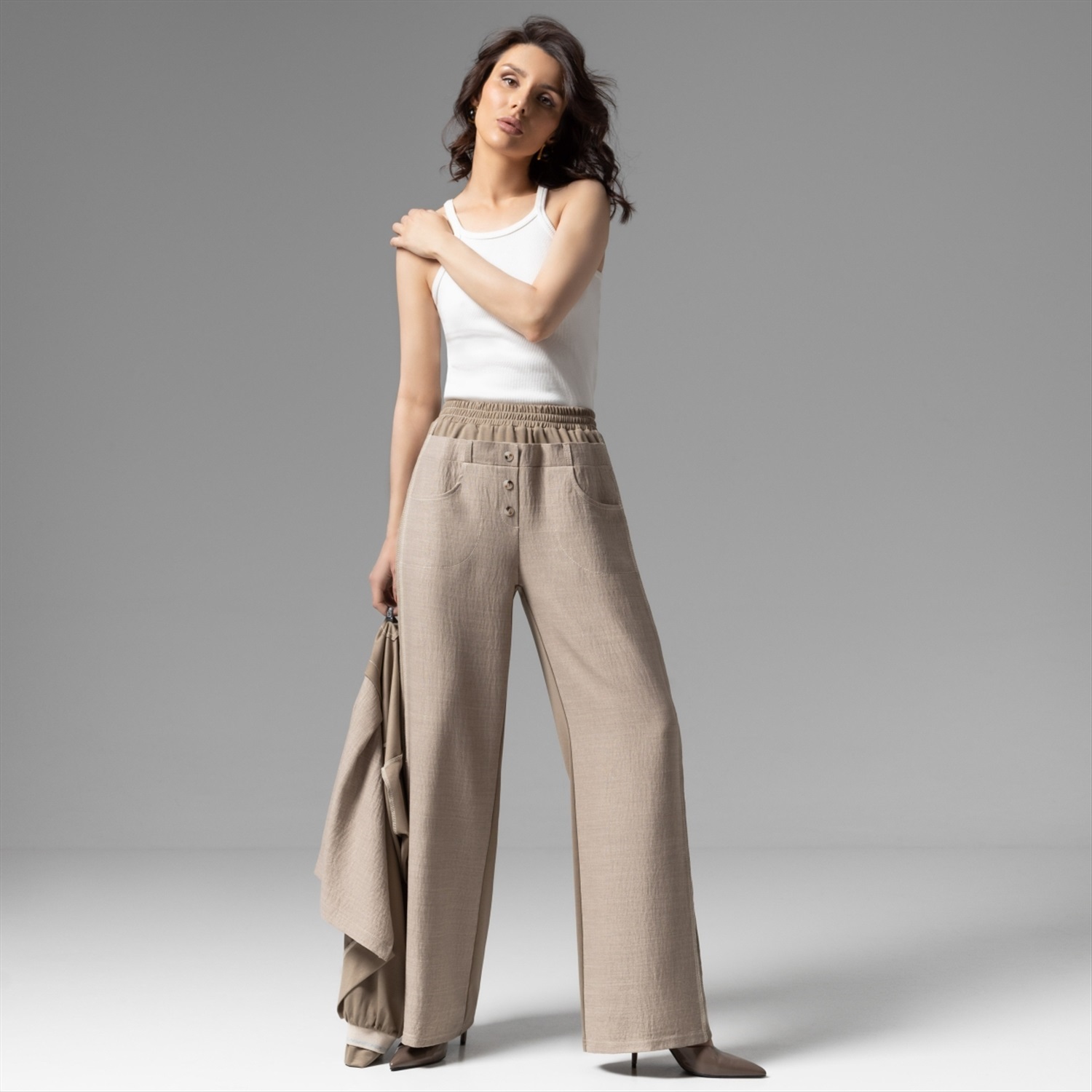 ТН ВЭД: 6104630000; Состав: Костюмная ткань «люсан», трикотаж «милано» + трикотаж подклад (65% полиэстер, 30% вискоза, 5% спандекс); Плотность ткани: Средняя; Тип ткани: Трикотаж, текстиль; Вид застежки: Нет; Высота посадки: Высокая; Декоративные элементы: Другое; Дополнительный цвет ткани: Бежевый; Карманы: Накладные; Основной цвет ткани: Бежевый; Отрезная талия: Есть; Подклад: Есть; Резинка по талии: Есть; Рисунок/раппорт: Нет, все изделия идентичны; Сезон: Круглогодичный; Силуэт: Свободный; Стиль: Повседневный; Фасон брюк: Широкие