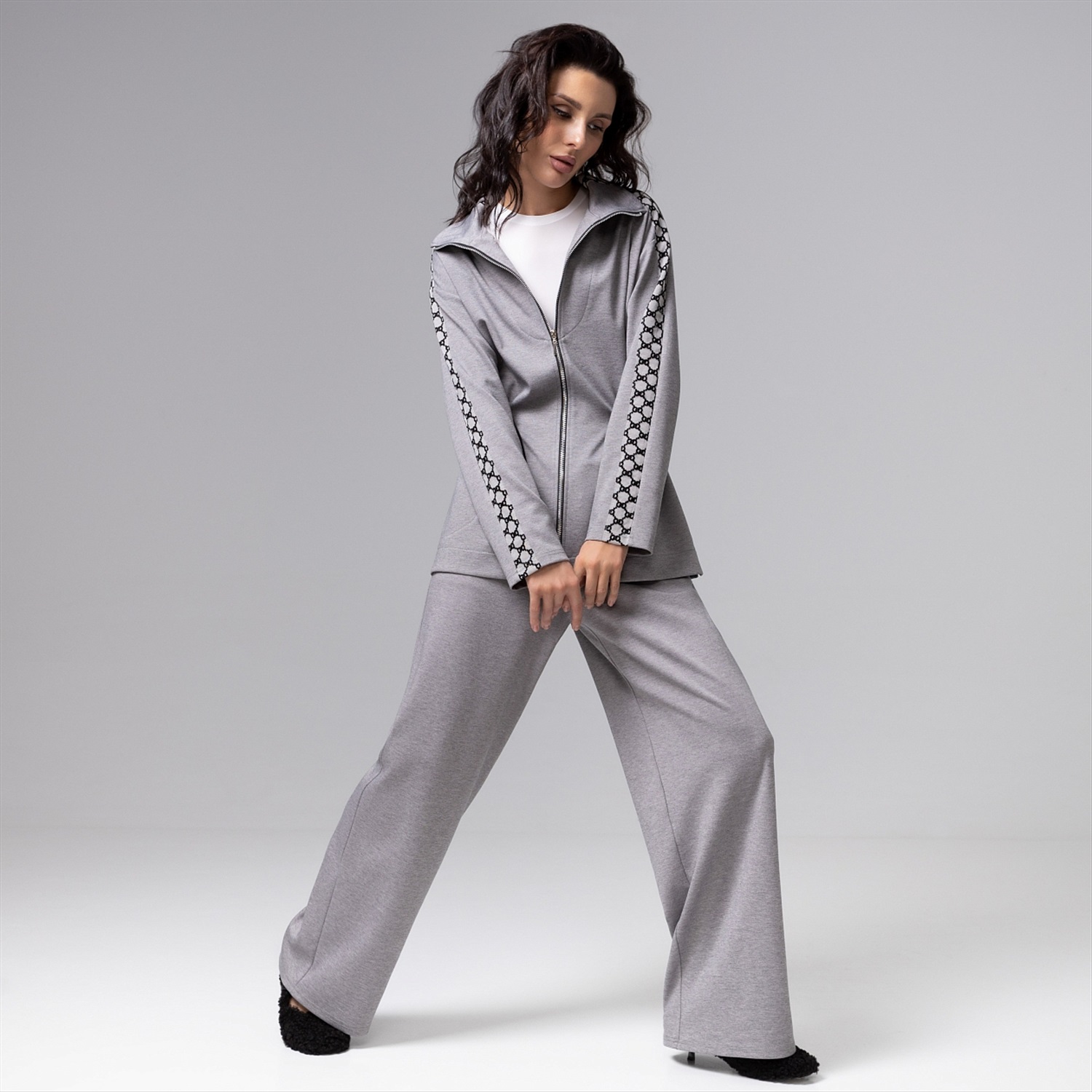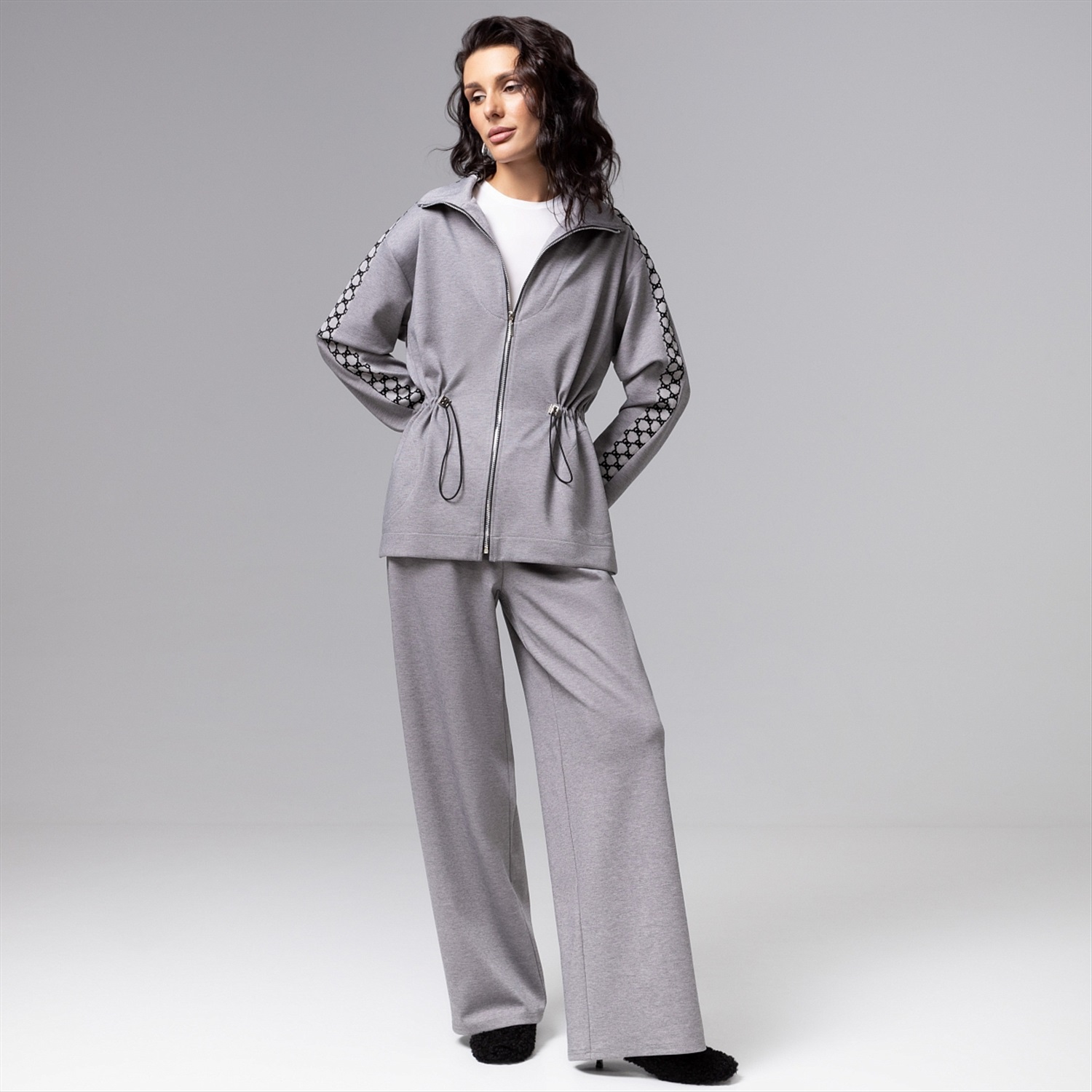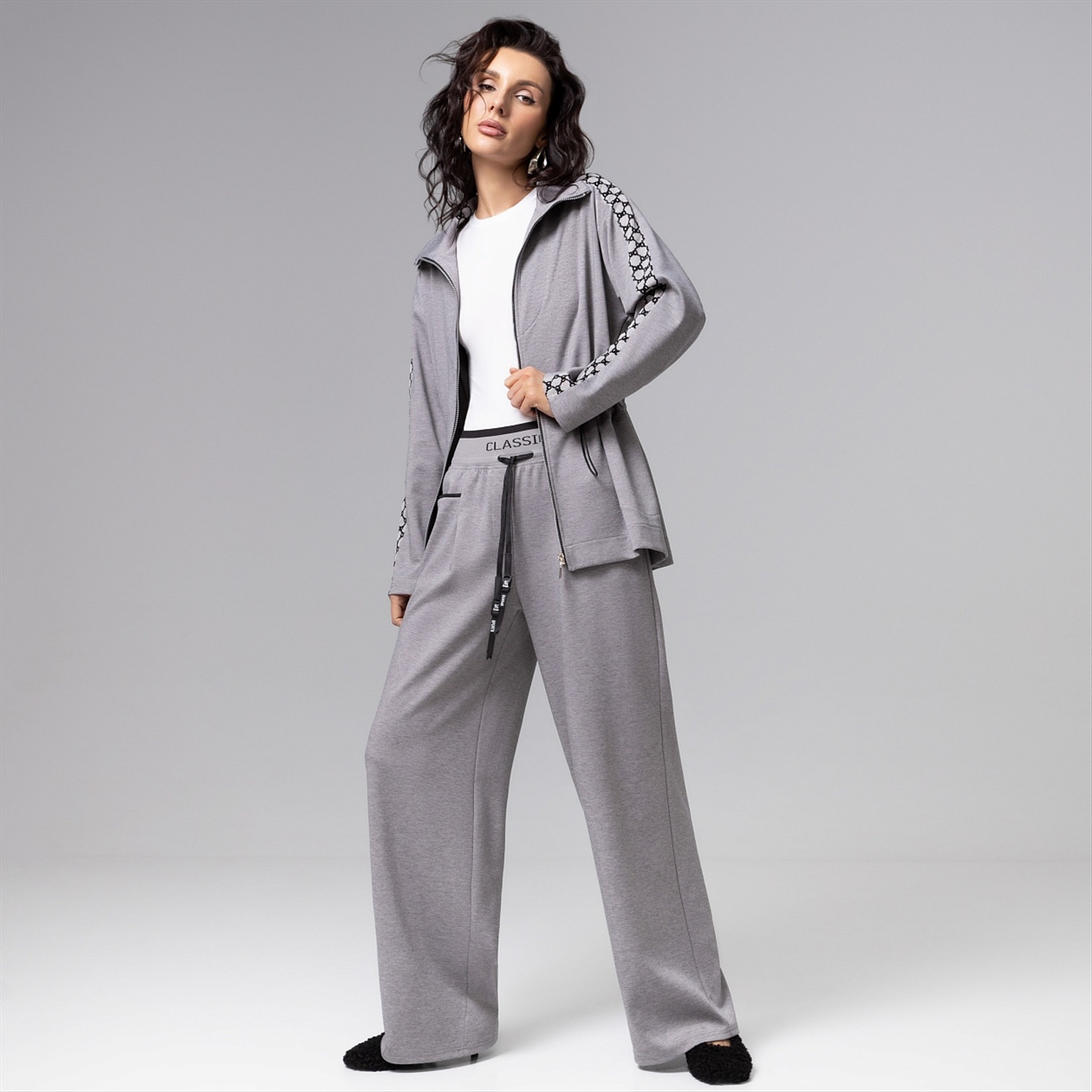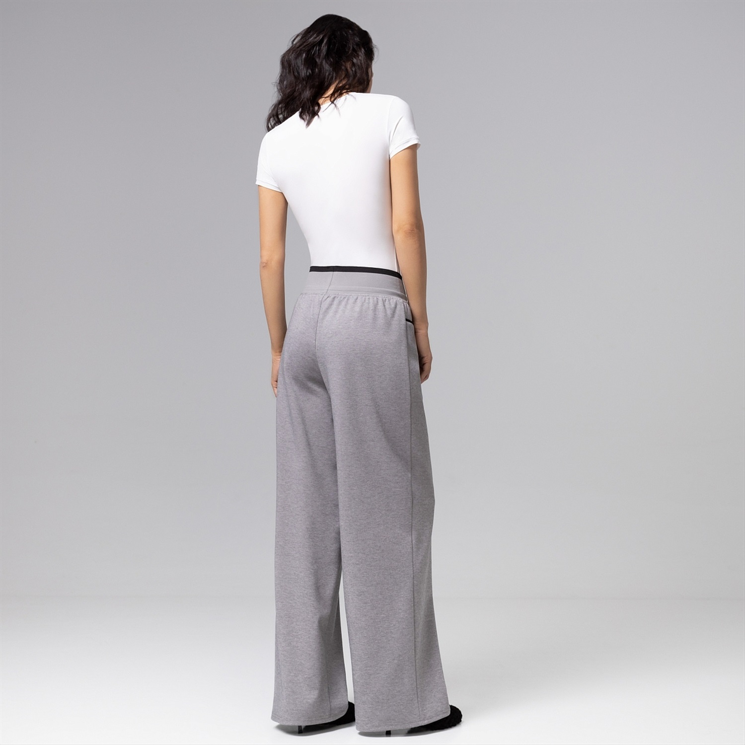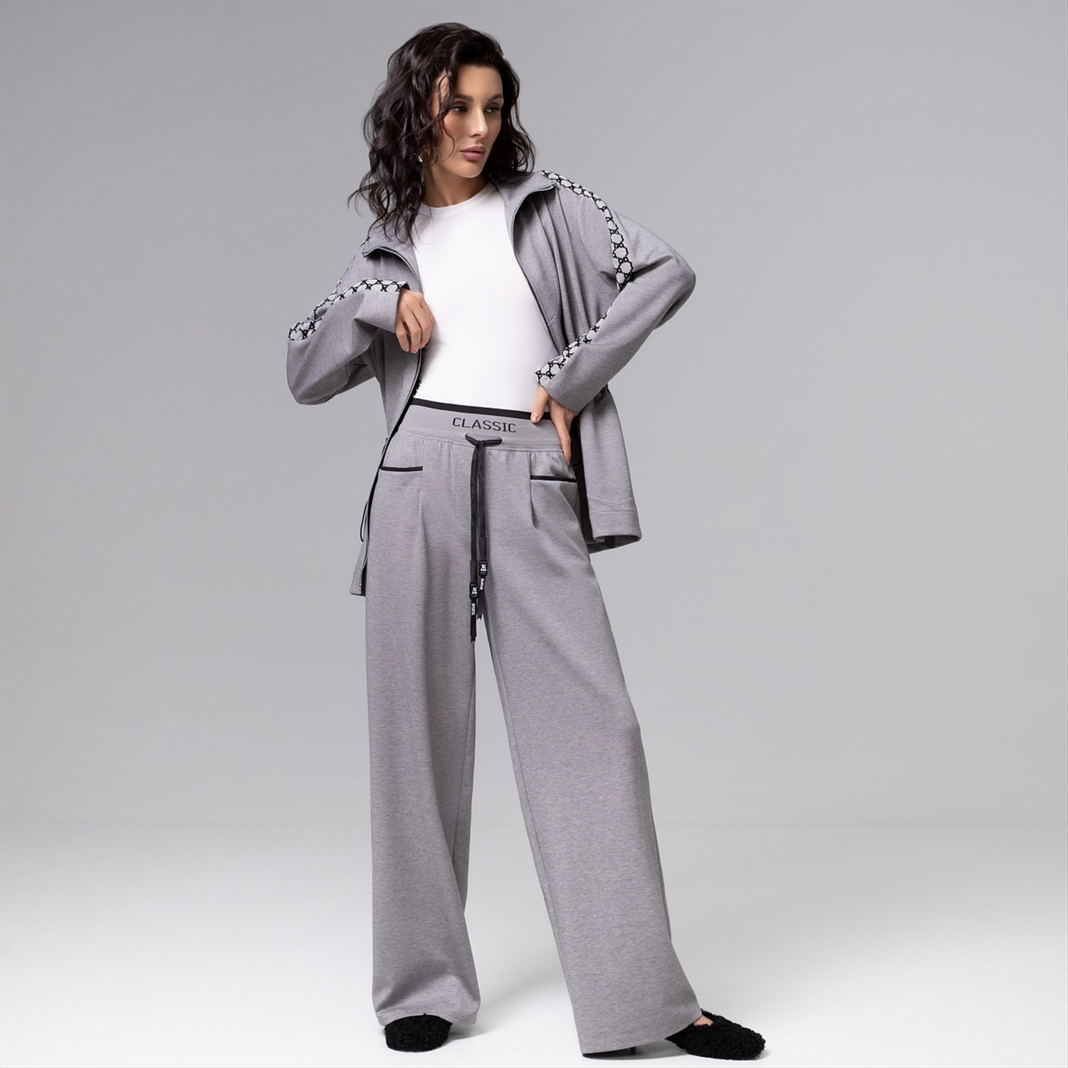 Эти брюки не просто дополняют образ – они диктуют ритм вашему дню. Мягкая ткань играет с пространством, превращая обычную походку в танец. Модель с интегрированными карманами на передней стороне сохраняет безупречную чистоту кроя, подчеркивая сдержанную элегантность. Широкая трикотажная резинка на поясе обеспечивает комфорт и современный вид, идеально контрастируя с благородным серым оттенком ткани.