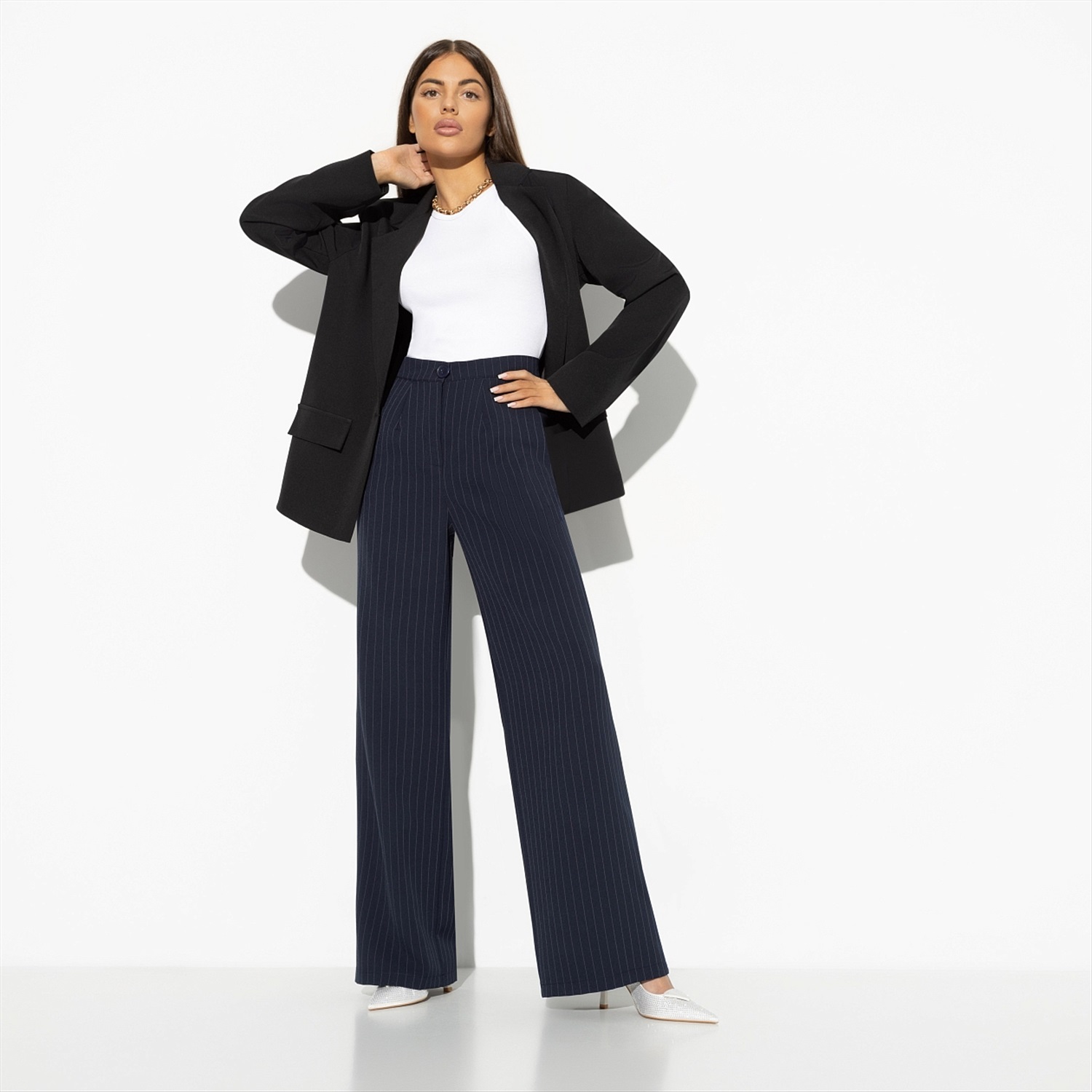 ТН ВЭД: 6204631800; Состав: «Полоска костюмная» (60% полиэстер, 37% вискоза, 3% спандекс); Плотность ткани: Средняя; Тип ткани: Текстиль; Вид застежки: Молния; Карманы: В боковом шве; Основной цвет ткани: Синий; Подклад: Нет; Резинка по талии: Нет; Рисунок/раппорт: Нет, все изделия идентичны; Сезон: Круглогодичный; Силуэт: Свободный; Стиль: Классический; Фасон брюк: Классические