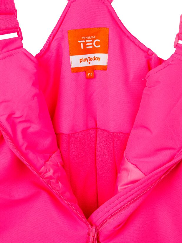 Мембранный материал делает этот яркий и модный полукомбинезон непромокаемым: мембрана не пропускает влагу снаружи, но выводит её изнутри, что крайне важно во время подвижных игр и занятий спортом.