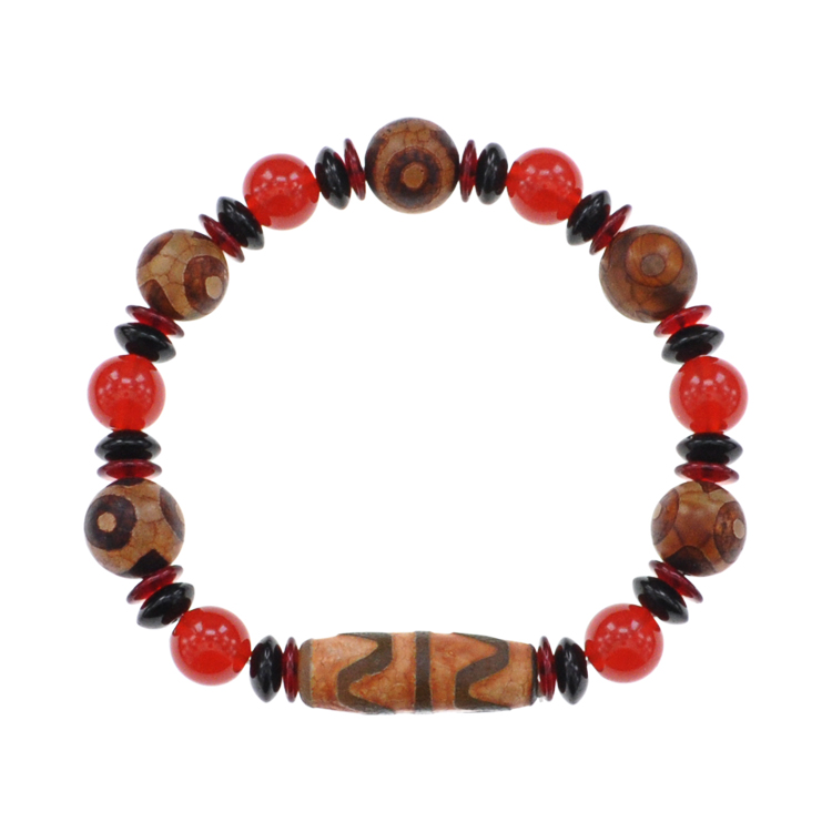 Стрейч-браслет с бусинами Дзи 3 глаза и Двойной клык тигра из натурального агата.