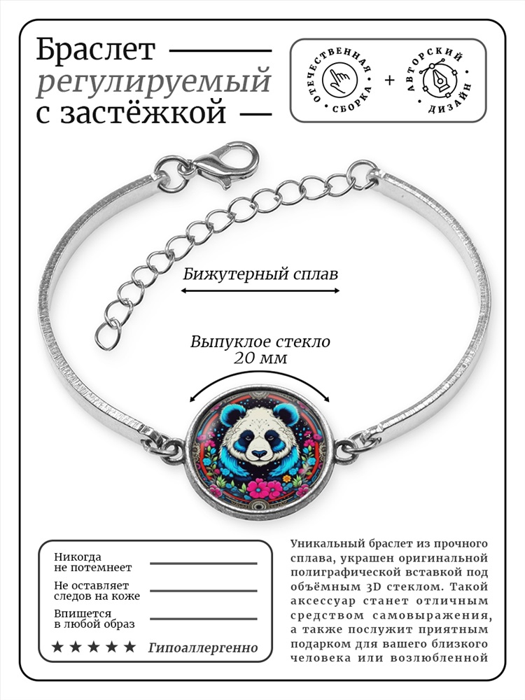 Браслет из бижутерного сплава с регулируемой по длине застёжкой. Изображение диаметром 20 мм прикрыто выпуклой стеклянной линзой. Товар упакован в прозрачный пакет. Без описания.