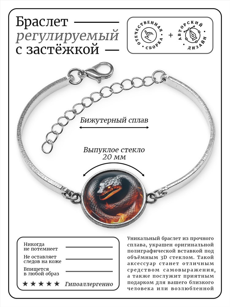 Браслет из бижутерного сплава с регулируемой по длине застёжкой. Изображение диаметром 20 мм прикрыто выпуклой стеклянной линзой. Товар упакован в прозрачный пакет. Без описания.